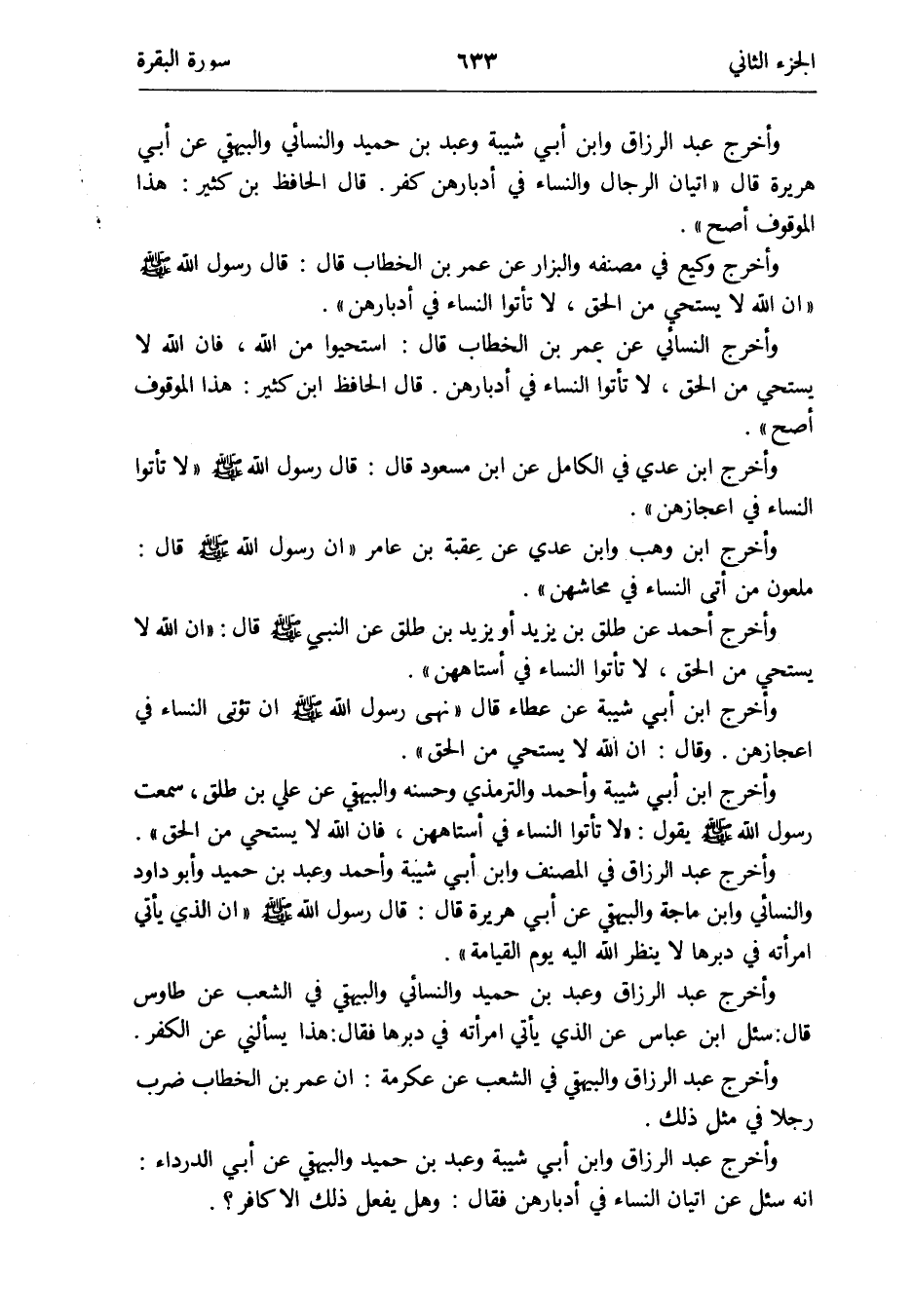 وَأخرج عبد الرَّزَّاق فِي المُصَنّف وَابْن أبي شيبَة وَأحمد وَعبد بن حميد وَأَبُو دَاوُد وَالنَّسَائِيّ وَابْن ماجة وَالْبَيْهَقِيّ عَن أبي هُرَيْرَة قَالَ: قَالَ رَسُول الله صلى الله عَلَيْهِ وَسلم إِن الَّذِي يَأْتِي امْرَأَته فِي دبرهَا لَا ينظر الله إِلَيْهِ يَوْم الْقِيَامَة