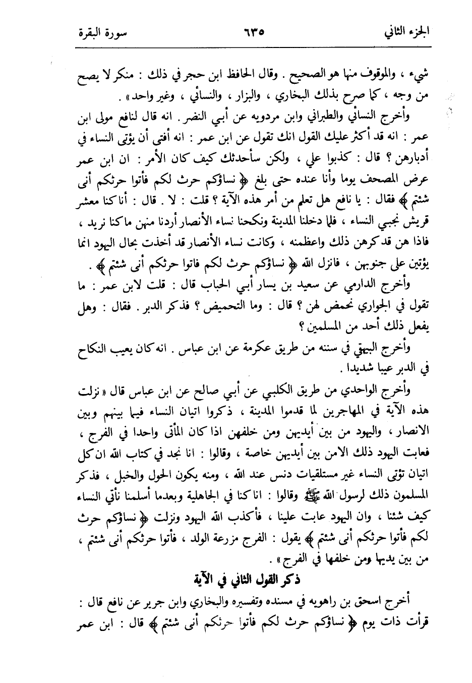 ذكر القَوْل الثَّانِي فِي الْآيَة أخرج اسحق ابْن رَاهَوَيْه فِي مُسْنده وَتَفْسِيره وَالْبُخَارِيّ وَابْن جرير عَن نَافِع قَالَ قَرَأت ذَات يَوْم {نِسَاؤُكُمْ حرث لكم فَأتوا حَرْثكُمْ أَنى شِئْتُم} قَالَ: ابْن عمر
