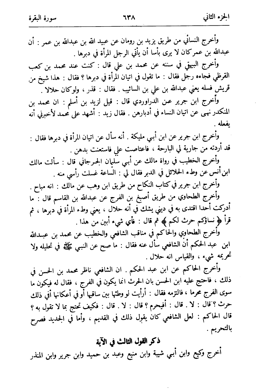 وَأخرج الْبَيْهَقِيّ فِي سنَنه عَن مُحَمَّد بن عَليّ قَالَ: كنت عِنْد مُحَمَّد بن كَعْب الْقرظِيّ فَجَاءَهُ رجل فَقَالَ: مَا تَقول فِي إتْيَان الْمَرْأَة فِي دبرهَا فَقَالَ: هَذَا شيخ من قُرَيْش فسله يَعْنِي عبد الله بن عَليّ بن السَّائِب