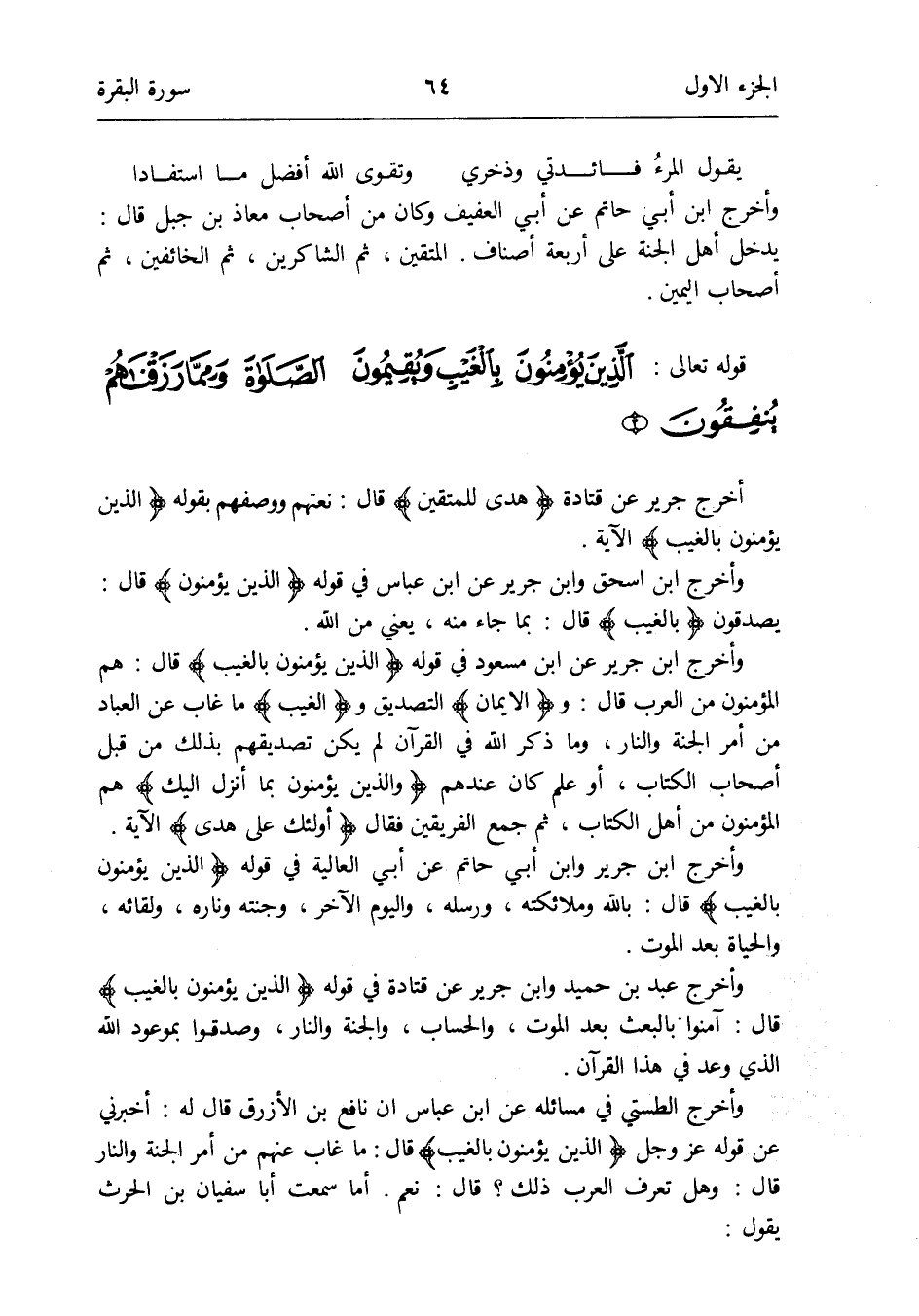 وَأخرج ابْن جرير عَن ابْن مَسْعُود فِي قَوْله {الَّذين يُؤمنُونَ بِالْغَيْبِ} قَالَ: هم الْمُؤْمِنُونَ من الْعَرَب قَالَ: و {الإِيمان} التَّصْدِيق و {الْغَيْب} مَا غَابَ عَن الْعباد من أَمر الْجنَّة وَالنَّار وَمَا ذكر الله فِي الْقُرْآن لم يكن تصديقهم بذلك من قبل أَصْحَاب الْكتاب أَو علم كَانَ عِنْدهم {وَالَّذين يُؤمنُونَ بِمَا أنزل إِلَيْك} هم الْمُؤْمِنُونَ من أهل الْكتاب ثمَّ جمع الْفَرِيقَيْنِ فَقَالَ {أُولَئِكَ على هدى} الْآيَة