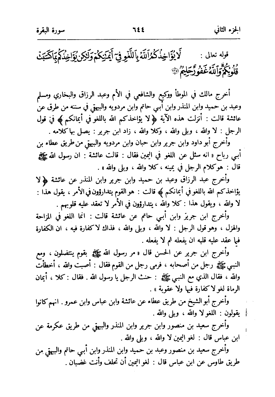 أخرج مَالك فِي الْمُوَطَّأ ووكيع وَالشَّافِعِيّ فِي الْأُم وَعبد الرَّزَّاق وَالْبُخَارِيّ وَمُسلم وَعبد بن حميد وَابْن الْمُنْذر وَابْن أبي حَاتِم وَابْن مرْدَوَيْه وَالْبَيْهَقِيّ فِي سنَنه من طرق عَن عَائِشَة قَالَت: أنزلت هَذِه الْآيَة {لَا يُؤَاخِذكُم الله بِاللَّغْوِ فِي أَيْمَانكُم} فِي قَول الرجل: لَا وَالله وبلى وَالله وكلا وَالله زَاد ابْن جرير: يصل بهَا كَلَامه