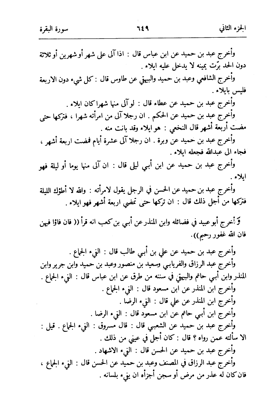 وَأخرج عبد بن حميد عَن ابْن عَبَّاس قَالَ: إِذا آلى على شهر أَو شَهْرَيْن أَو ثَلَاثَة دون الْحَد برّت يَمِينه لَا يدْخل عَلَيْهِ إِيلَاء