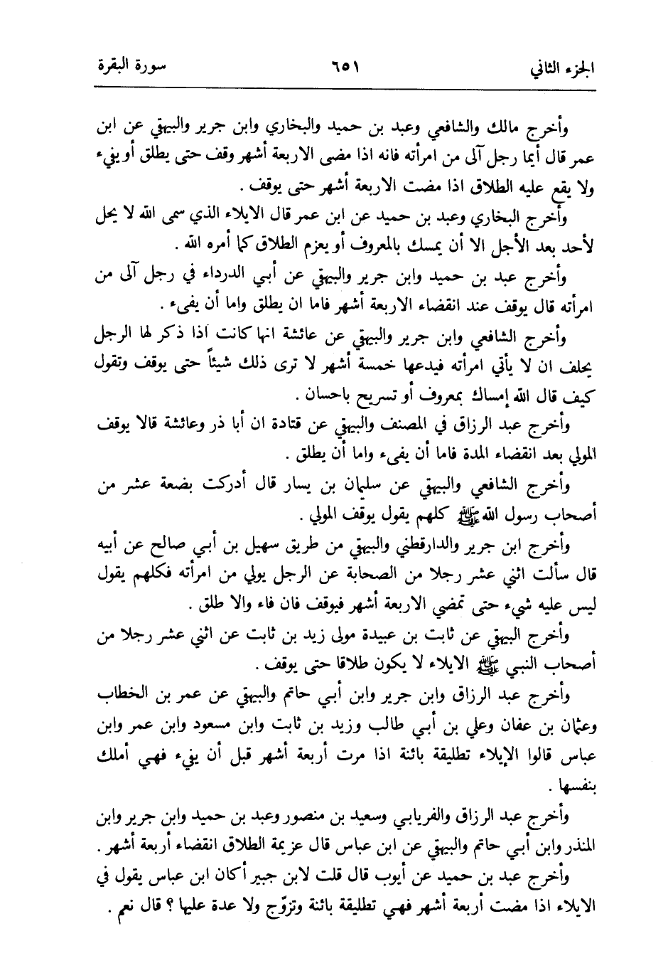وَأخرج مَالك وَالشَّافِعِيّ وَعبد بن حميد وَالْبُخَارِيّ وَابْن جرير وَالْبَيْهَقِيّ عَن ابْن عمر قَالَ أَيّمَا رجل آلى من امْرَأَته فَإِن إِذا مضى الْأَرْبَعَة أشهر وقف حَتَّى يُطلق أَو يفِيء وَلَا يَقع عَلَيْهِ الطَّلَاق إِذا مَضَت الْأَرْبَعَة أشهر حَتَّى يُوقف