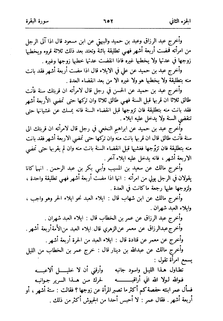 وَأخرج عبد الرَّزَّاق وَعبد بن حميد وَالْبَيْهَقِيّ عَن ابْن مَسْعُود قَالَ إِذا آلى الرجل من امْرَأَته فمضت أَرْبَعَة أشهر فَهِيَ تَطْلِيقَة بَائِنَة وَتعْتَد بعد ذَلِك ثَلَاثَة قُرُوء ويخطبها زَوجهَا فِي عدتهَا وَلَا يخطبها غَيره فَإِذا انْقَضتْ عدتهَا خطبهَا زَوجهَا وَغَيره