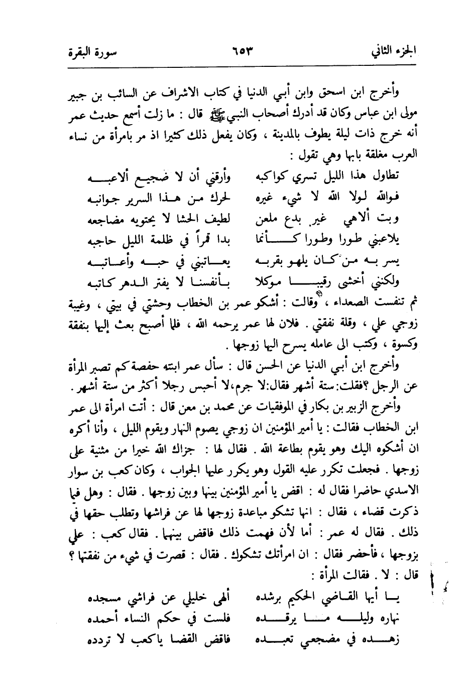 وَأخرج ابْن إِسْحَق وَابْن أبي الدُّنْيَا فِي كتاب الْأَشْرَاف عَن السَّائِب بن جُبَير مولى ابْن عَبَّاس وَكَانَ قد أدْرك أَصْحَاب النَّبِي صلى الله عَلَيْهِ وَسلم قَالَ: مَا زلت أسمع حَدِيث عمر أَنه خرج ذَات لَيْلَة يطوف بِالْمَدِينَةِ وَكَانَ يفعل ذَلِك كثيرا إِذْ مر بِامْرَأَة من نسَاء الْعَرَب مغلقة بَابهَا وَهِي تَقول: تطاول هَذَا اللَّيْل تسري كواكبه وأرقني أَن لَا ضجيع ألاعبه فوَاللَّه لَوْلَا الله لَا شَيْء غَيره لحرك من هَذَا السرير جوانبه وَبت ألاهي غير بدع ملعن لطيف الحشا لَا يحتويه مضاجعه يلاعبني طوراً وطوراً كَأَنَّمَا بدا قمراً فِي ظلمَة اللَّيْل حَاجِبه يسر بِهِ من كَانَ يلهو بِقُرْبِهِ يعاتبني فِي حبه واعاتبه ولكنني أخْشَى رقيبا موكلا بِأَنْفُسِنَا لَا يفتر الدَّهْر كَاتبه ثمَّ تنفست الصعداء وَقَالَت: أَشْكُو عمر بن الْخطاب وحشتي فِي بَيْتِي وغيبة زَوجي عَليّ وَقلة نفقتي