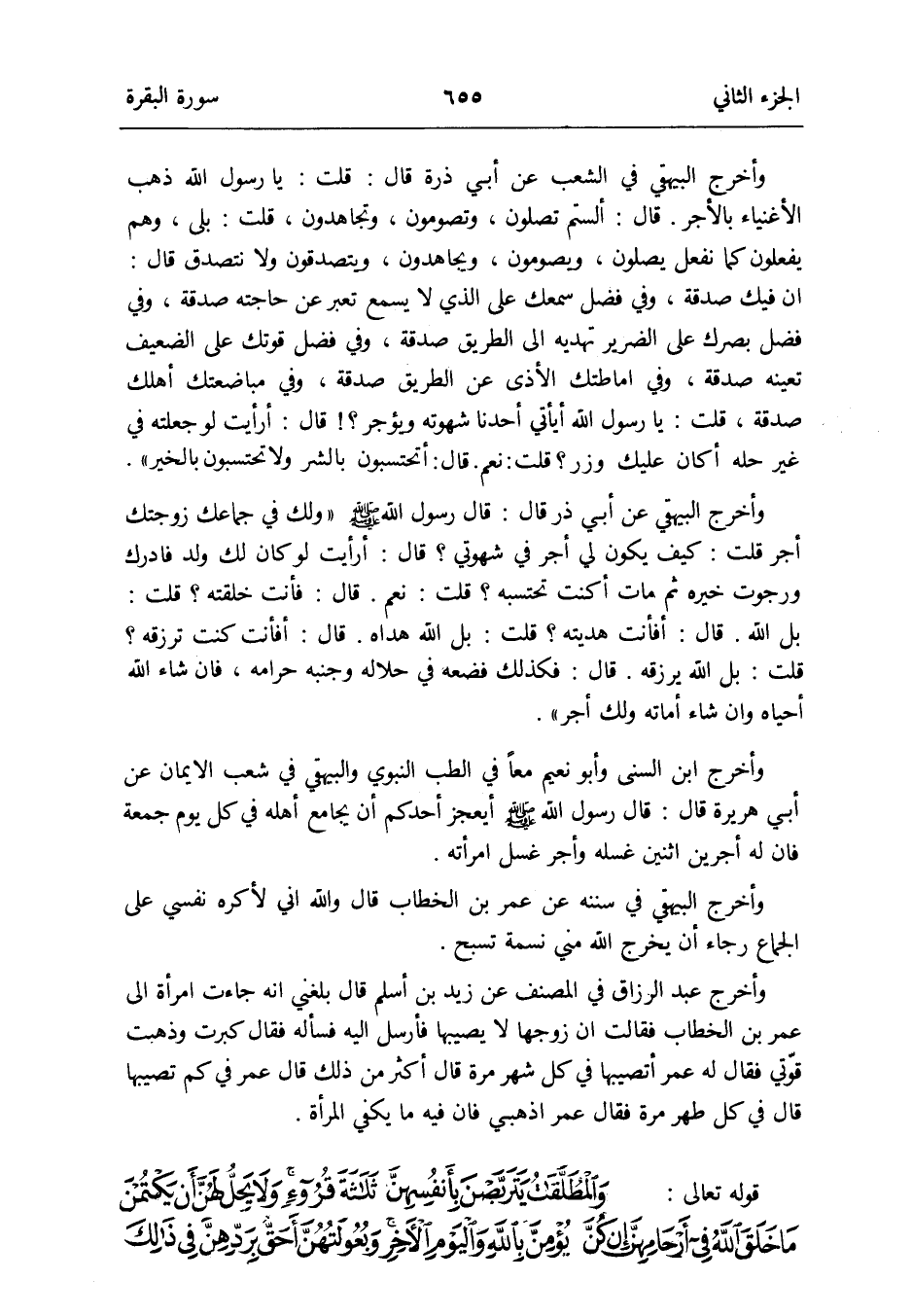 وَأخرج الْبَيْهَقِيّ فِي الشّعب عَن أبي ذرة قَالَ: قَالَ رَسُول الله صلى الله عَلَيْهِ وَسلم وَلَك فِي جماعك زَوجتك أجر قلت: كَيفَ يكون لي أجر فِي شهوتي قَالَ: أَرَأَيْت لَو كَانَ لَك ولد فَأدْرك ورجوت خَيره ثمَّ مَاتَ أَكنت تحتسبه قلت: نعم