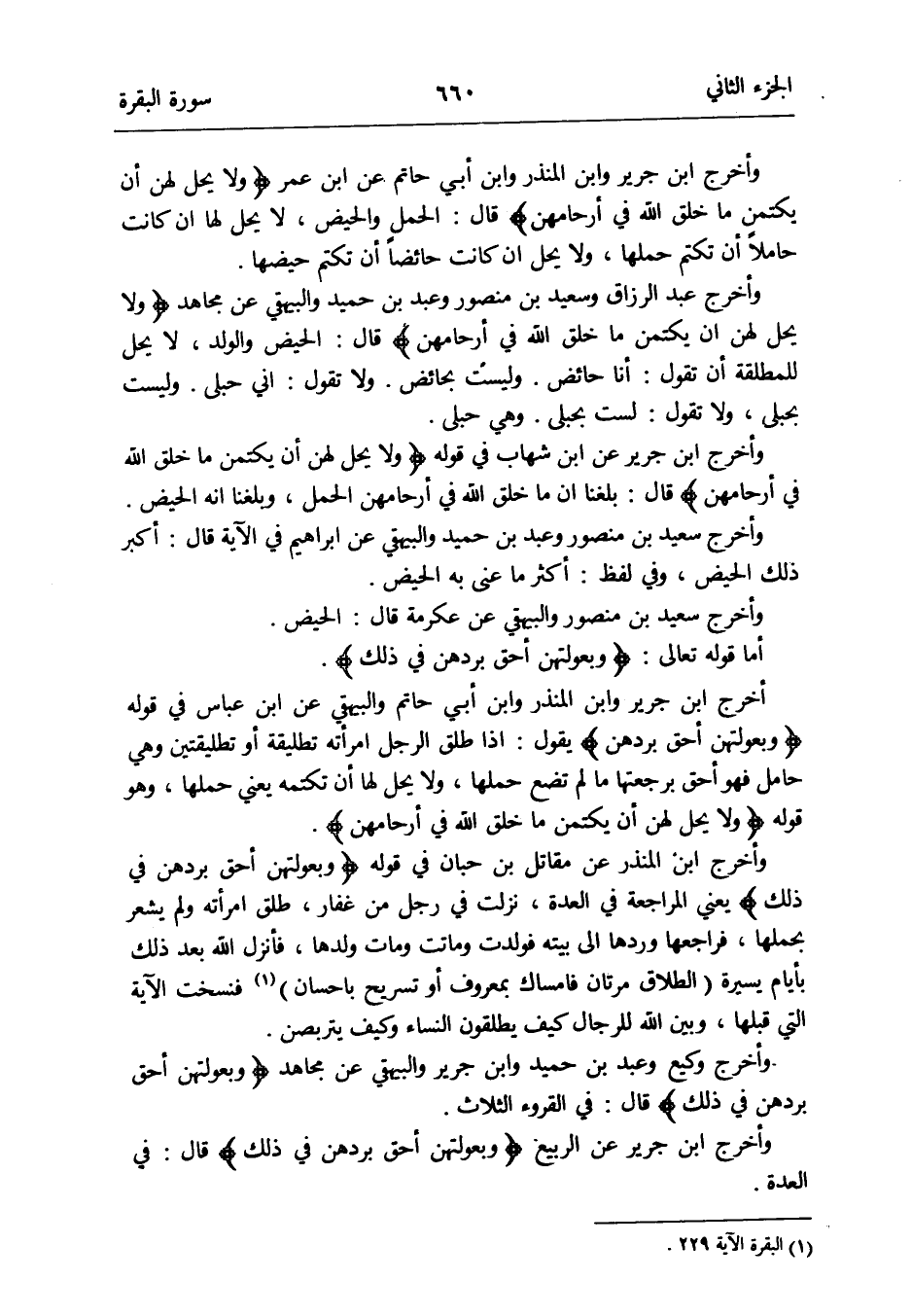 أخرج ابْن جرير وَابْن الْمُنْذر وَابْن أبي حَاتِم وَالْبَيْهَقِيّ عَن ابْن عَبَّاس فِي قَوْله {وبعولتهن أَحَق بردهن فِي ذَلِك} يَقُول: إِذا طلق الرجل امْرَأَته تَطْلِيقَة أَو تطلقتين وَهِي حَامِل فَهُوَ أَحَق برجعتها مَا لم تضع حملهَا وَلَا يحل لَهَا أَن تكتمه يَعْنِي حملهَا وَهُوَ قَوْله {وَلَا يحل لَهُنَّ أَن يكتمن مَا خلق الله فِي أرحامهن}