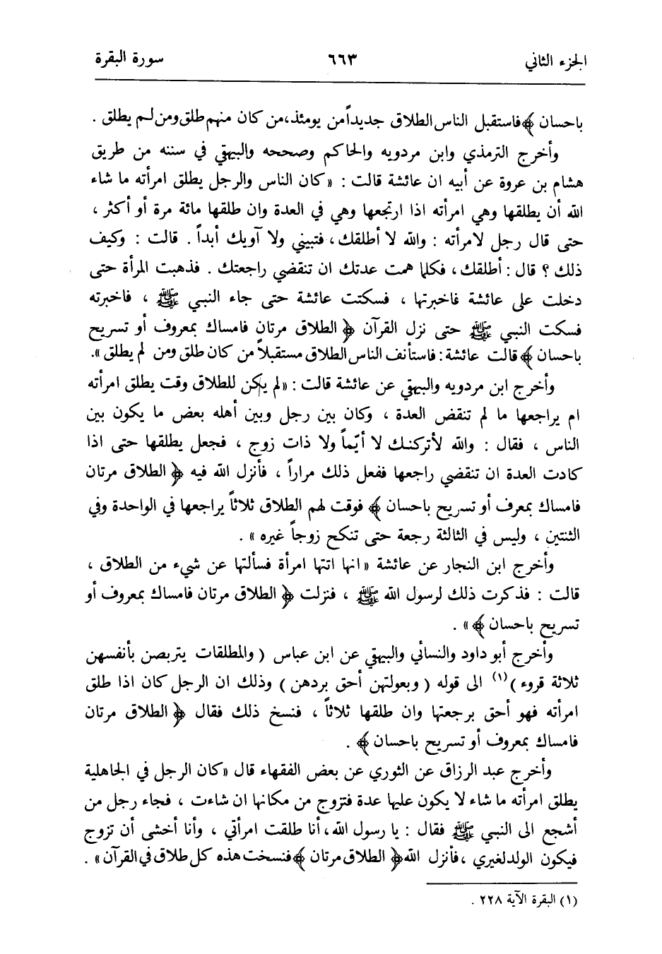 وَأخرج أَبُو دَاوُد وَالنَّسَائِيّ وَالْبَيْهَقِيّ عَن ابْن عَبَّاس (والمطلقات يَتَرَبَّصْنَ بِأَنْفُسِهِنَّ ثَلَاثَة قُرُوء) (الْبَقَرَة الْآيَة 228) إِلَى قَوْله (وبعولتهن أَحَق بردهن) وَذَلِكَ أَن الرجل كَانَ إِذا طلق امْرَأَته فَهُوَ أَحَق برجعتها وَإِن طَلقهَا ثَلَاثًا فنسخ ذَلِك فَقَالَ {الطَّلَاق مَرَّتَانِ فإمساك بِمَعْرُوف أَو تَسْرِيح بِإِحْسَان}