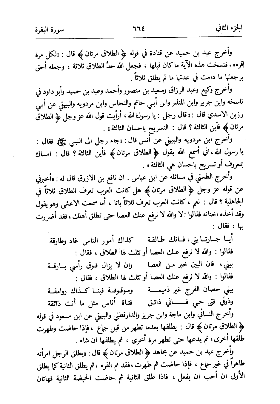 إِن نَافِع بن الْأَزْرَق قَالَ لَهُ: أَخْبرنِي عَن قَوْله عز وَجل {الطَّلَاق مَرَّتَانِ} هَل كَانَت تعرف الْعَرَب الطَّلَاق ثَلَاثًا فِي الْجَاهِلِيَّة قَالَ: نعم كَانَت الْعَرَب تعرف ثَلَاثًا باتاً أما سَمِعت الْأَعْشَى وَهُوَ يَقُول وَقد أَخذه أختانه فَقَالُوا: وَالله لَا نرفع عَنْك الْعَصَا حَتَّى تطلق أهلك فقد أضررت بهَا فَقَالَ: أيا جارتا بتي فَإنَّك طالقة كَذَاك أُمُور النَّاس غاد وطارقة فَقَالُوا: وَالله لَا نرفع عَنْك الْعَصَا أَو تثلث لَهَا الطَّلَاق فَقَالَ: بيني فَإِن الْبَين خير من الْعَصَا وَإِن لَا يزَال فَوق رَأْسِي بارقة فَقَالُوا: وَالله لَا نرفع عَنْك الْعَصَا أَو تثلث لَهَا الطَّلَاق فَقَالَ: بيني حصان الْفرج غير ذميمة وموقوفة فِينَا كَذَاك روامقة وذوقي فَتى حَيّ فَإِنِّي ذائق فتاة أنَاس مثل مَا أَنْت ذائقة وَأخرج النَّسَائِيّ وَابْن ماجة وَابْن جرير وَالدَّارَقُطْنِيّ وَالْبَيْهَقِيّ عَن ابْن مَسْعُود فِي قَوْله {الطَّلَاق مَرَّتَانِ} قَالَ: يطلقهَا بَعْدَمَا تطهر من قبل جماع فَإِذا حَاضَت وطهرت طَلقهَا أُخْرَى ثمَّ يَدعهَا تطهر مرّة أُخْرَى ثمَّ يطلقهَا إِن شَاءَ