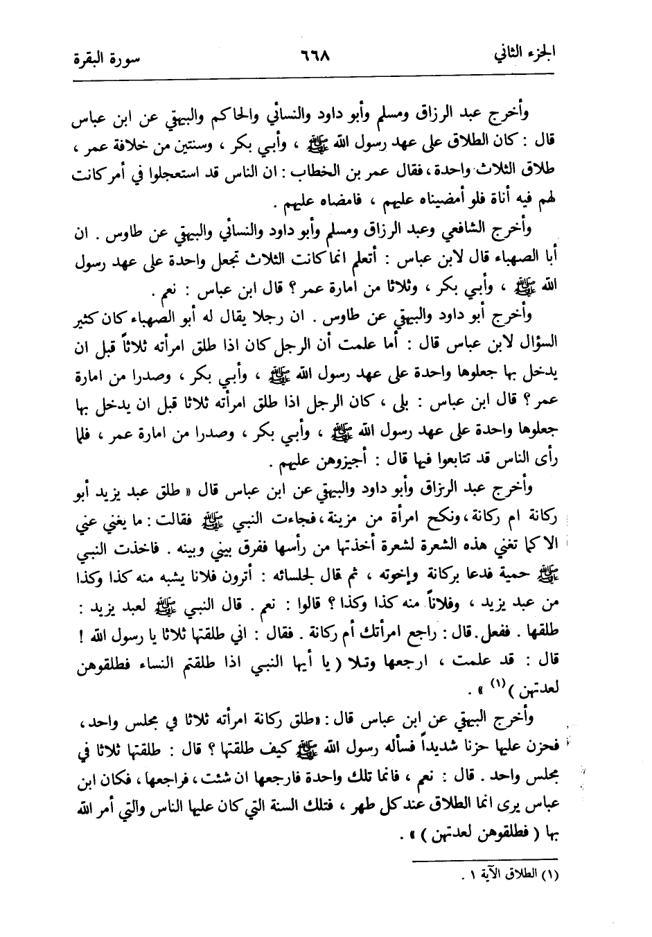وَأخرج عبد الرَّزَّاق وَمُسلم وَأَبُو دَاوُد وَالنَّسَائِيّ وَالْحَاكِم وَالْبَيْهَقِيّ عَن ابْن عَبَّاس قَالَ: كَانَ الطَّلَاق على عهد رَسُول الله صلى الله عَلَيْهِ وَسلم وَأبي بكر وسنتين من خلَافَة عمر طَلَاق الثَّلَاث وَاحِدَة فَقَالَ عمر بن الْخطاب: أَن النَّاس قد استعجلوا فِي أَمر كَانَت لَهُم فِيهِ أَنَاة فَلَو امضيناه عَلَيْهِم فأمضاه عَلَيْهِم