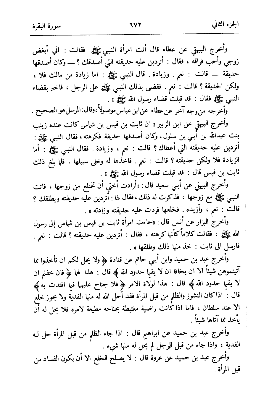 وَأخرج الْبَيْهَقِيّ عَن عَطاء قَالَ أَتَت امْرَأَة النَّبِي صلى الله عَلَيْهِ وَسلم فَقَالَت: إِنِّي أبْغض زَوجي وَأحب فِرَاقه فَقَالَ: أَتردينَ حديقته الَّتِي أصدقك - وَكَانَ أصدقهَا حديقة - قَالَت: نعم