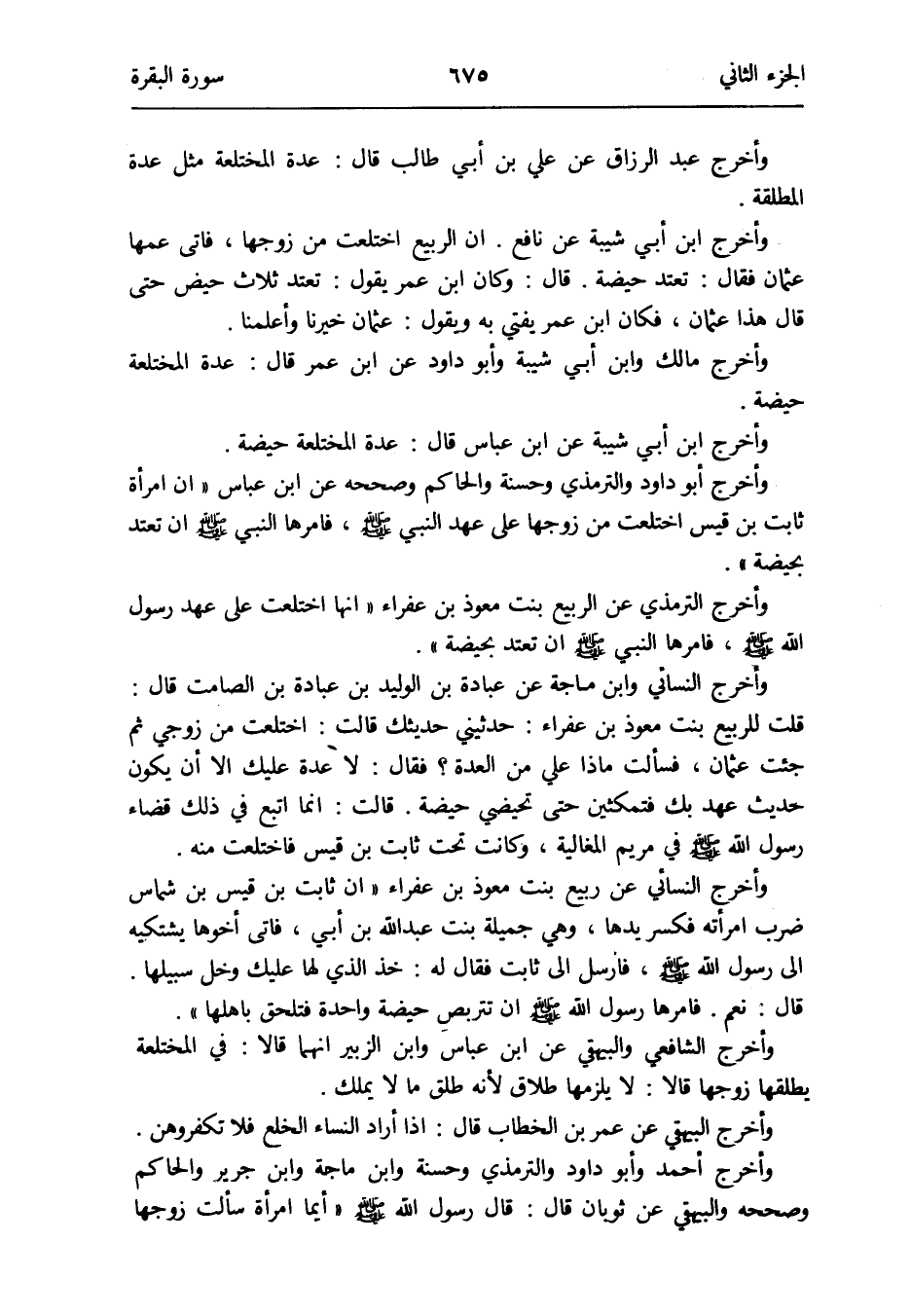 وَأخرج النَّسَائِيّ وَابْن ماجة عَن عبَادَة بن الْوَلِيد عَن عبَادَة بن الصَّامِت قَالَ: قلت للربيع بنت معوذ بن عفراء: حدثيني حَدِيثك قَالَت: اخْتلعت من زَوجي ثمَّ جِئْت عُثْمَان فَسَأَلت مَاذَا عَليّ من الْعدة فَقَالَ: لَا عدَّة عَلَيْك إلاَّ أَن يكون حَدِيث عهد بك فتمكثين حَتَّى تحيضي حَيْضَة