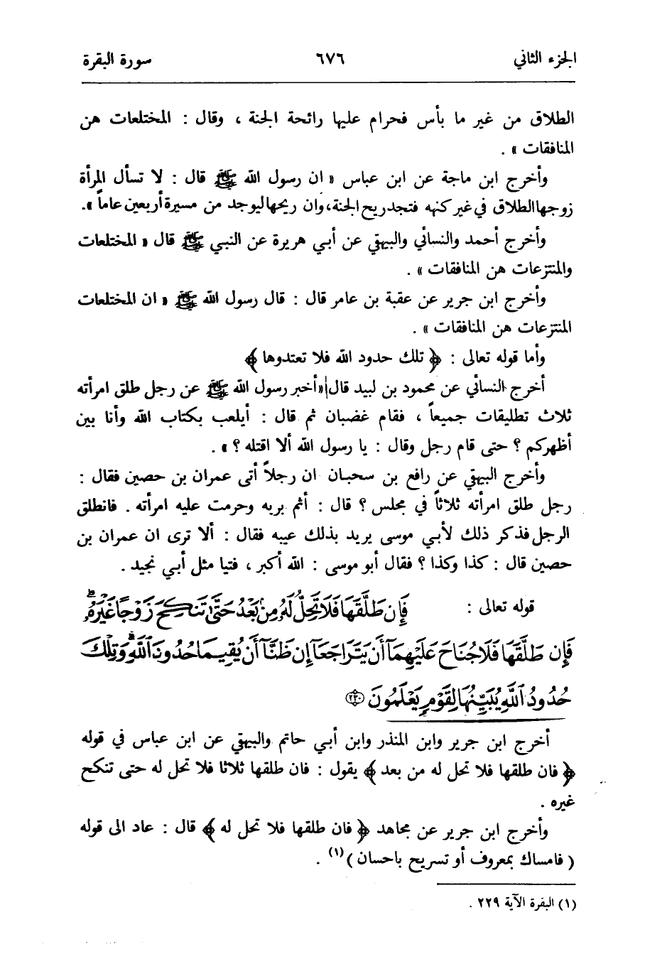 أخرج ابْن جرير وَابْن الْمُنْذر وَابْن أبي حَاتِم وَالْبَيْهَقِيّ عَن ابْن عَبَّاس فِي قَوْله {فَإِن طَلقهَا فَلَا تحل لَهُ من بعد} يَقُول: فَإِن طَلقهَا ثَلَاثًا فَلَا تحل لَهُ حَتَّى تنْكح غَيره