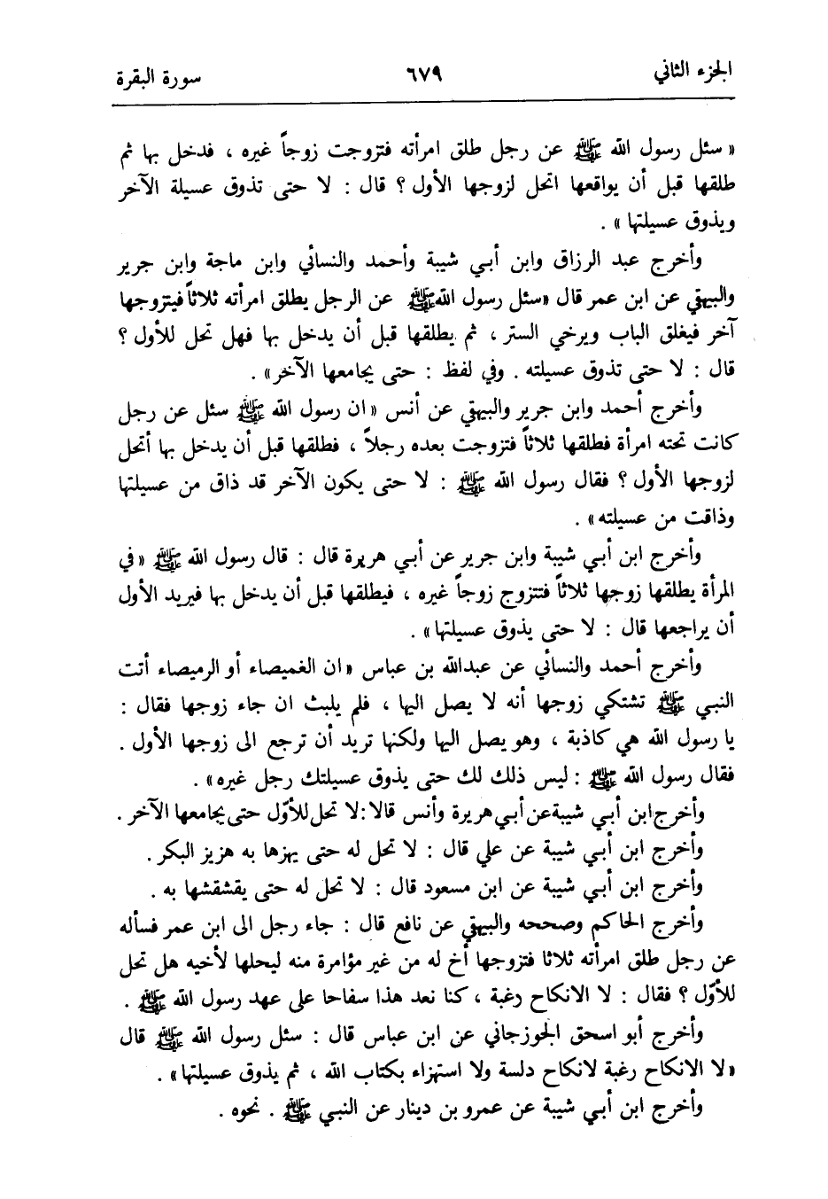 وَأخرج عبد الرَّزَّاق وَابْن أبي شيبَة وَأحمد وَالنَّسَائِيّ وَابْن ماجة وَابْن جرير وَالْبَيْهَقِيّ عَن ابْن عمر قَالَ سُئِلَ رَسُول الله صلى الله عَلَيْهِ وَسلم عَن الرجل يُطلق امْرَأَته ثَلَاثًا فيتزوجها آخر فيغلق الْبَاب ويرخي السّتْر ثمَّ يطلقهَا قبل أَن يدْخل بهَا فَهَل تحل للْأولِ قَالَ: لَا حَتَّى تذوق عُسَيْلَته