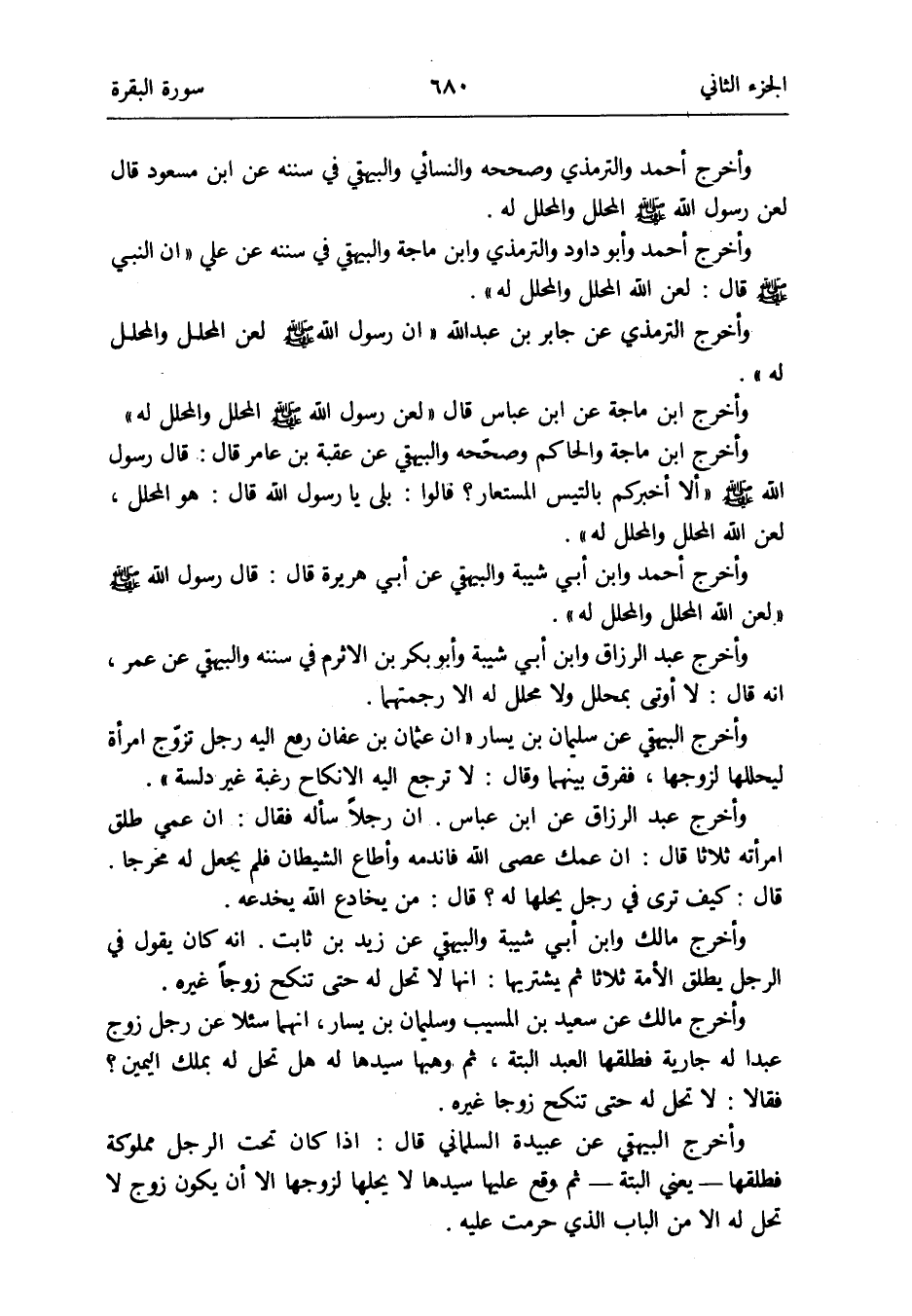 وَأخرج أَحْمد وَالتِّرْمِذِيّ وَصَححهُ وَالنَّسَائِيّ وَالْبَيْهَقِيّ فِي سنَنه عَن ابْن مَسْعُود قَالَ: لعن رَسُول الله صلى الله عَلَيْهِ وَسلم الْمُحَلّل والمحلل لَهُ