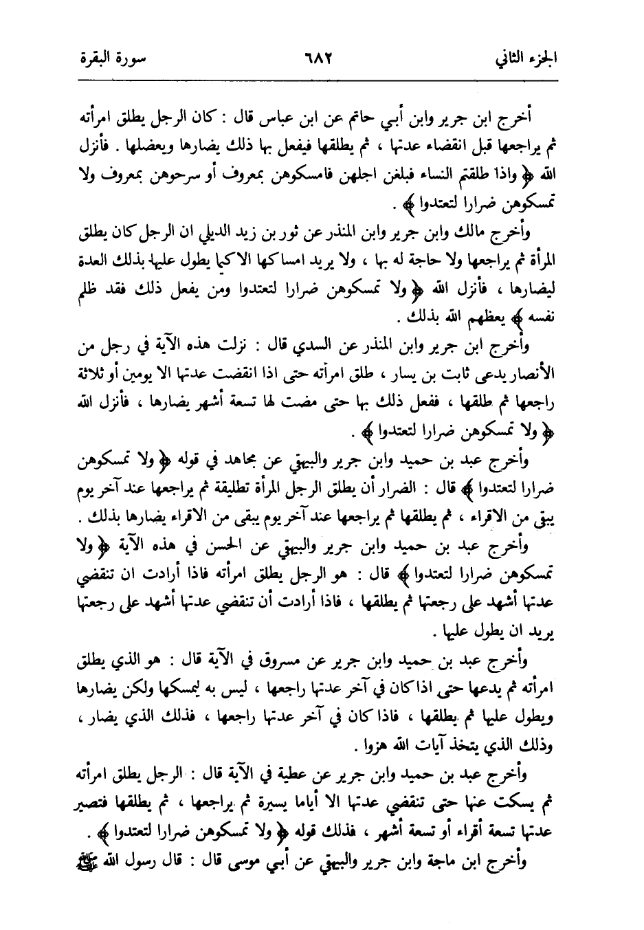 أخرج ابْن جرير وَابْن أبي حَاتِم عَن ابْن عَبَّاس قَالَ: كَانَ الرجل يُطلق امْرَأَته ثمَّ يُرَاجِعهَا قبل انْقِضَاء عدتهَا ثمَّ يطلقهَا فيفعل بهَا ذَلِك يضارها ويعضلها