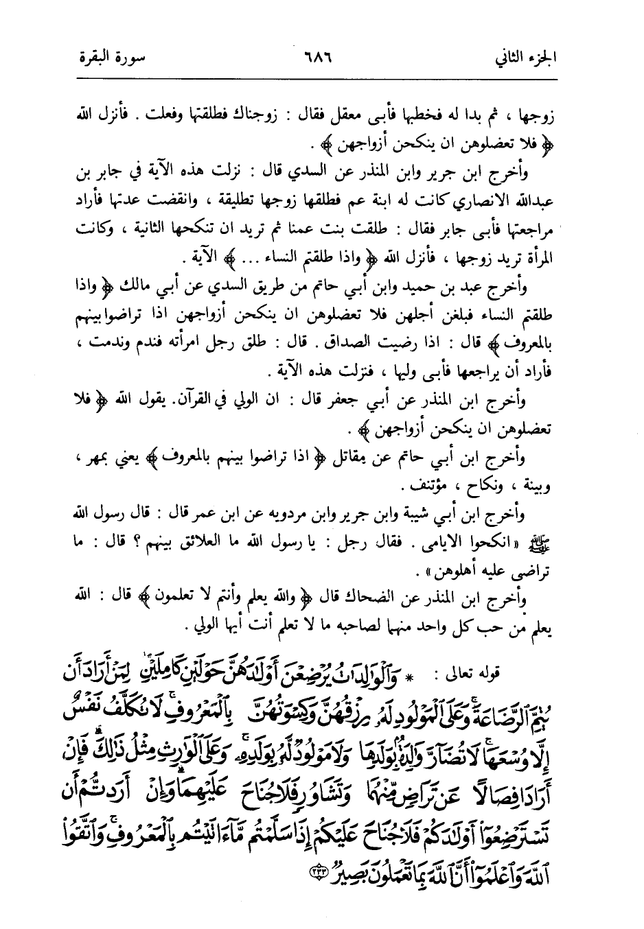 قَوْله تَعَالَى: والوالدات يرضعن أَوْلَادهنَّ حَوْلَيْنِ كَامِلين لمن أَرَادَ أَن يتم الرضَاعَة وعَلى الْمَوْلُود لَهُ رزقهن وكسوتهن بِالْمَعْرُوفِ لَا تكلّف نفس إِلَّا وسعهَا لَا تضار وَالِدَة بِوَلَدِهَا وَلَا مَوْلُود لَهُ بولده وعَلى الْوَارِث مثل ذَلِك فَإِن أَرَادَا فصالاً عَن ترَاض مِنْهُمَا وتشاور فَلَا جنَاح عَلَيْهِمَا وَإِن أردتم أَن تسترضعوا أَوْلَادكُم فَلَا جنَاح عَلَيْكُم إِذا سلمتم مَا آتيتم بِالْمَعْرُوفِ وَاتَّقوا الله وَاعْلَمُوا أَن الله بِمَا تَعْمَلُونَ بَصِير