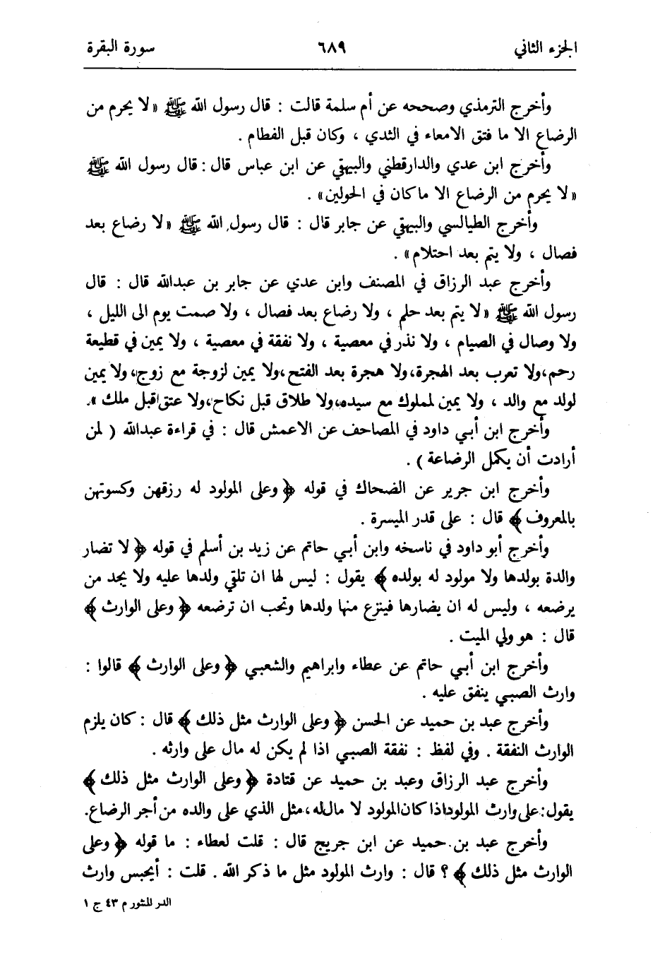وَأخرج عبد الرَّزَّاق وَعبد بن حميد عَن قَتَادَة {وعَلى الْوَارِث مثل ذَلِك} يَقُول: على وَارِث الْمَوْلُود إِذا كَانَ لَا مَال لَهُ مثل الَّذِي على وَالِده من أجر الرَّضَاع