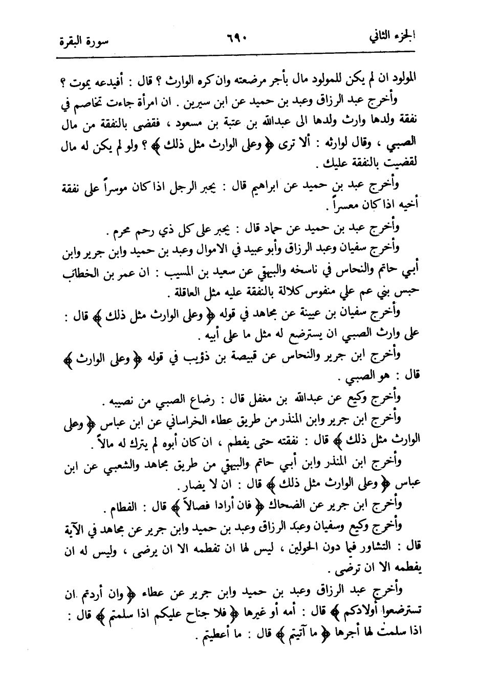 وَأخرج ابْن جرير والنحاس عَن قبيصَة بن ذُؤَيْب فِي قَوْله {وعَلى الْوَارِث} قَالَ: هُوَ الصَّبِي