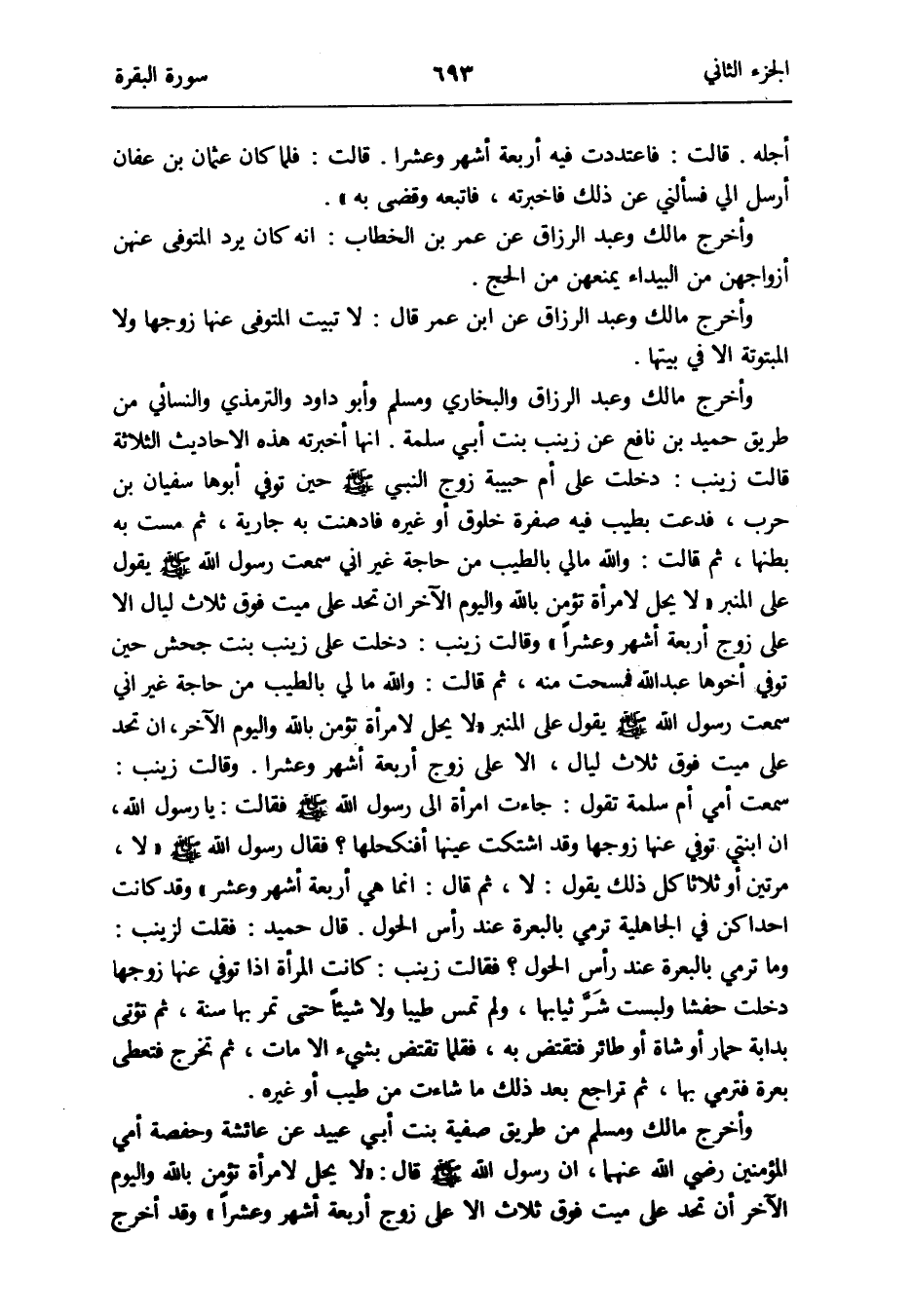 وَأخرج مَالك وَمُسلم من طَرِيق صَفِيَّة بنت أبي عبيد عَن عَائِشَة وَحَفْصَة أُمِّي الْمُؤمنِينَ رَضِي الله عَنْهُمَا أَن رَسُول الله صلى الله عَلَيْهِ وَسلم قَالَ: لَا يحل لامْرَأَة تؤمن بِاللَّه وَالْيَوْم الآخر أَن تحد على ميت فَوق ثَلَاث إِلَّا على زوج أَرْبَعَة أشهر وَعشر