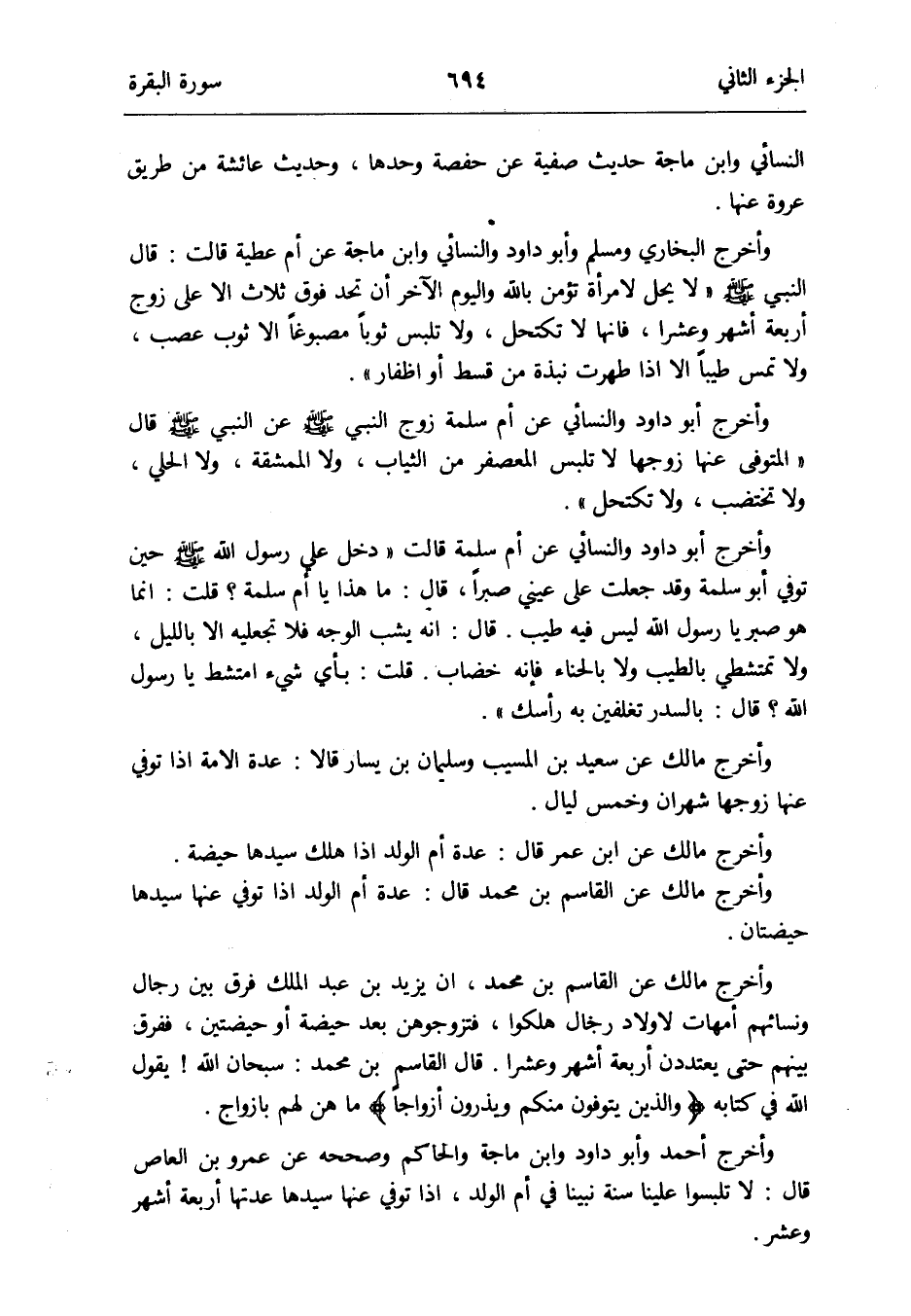 وَأخرج البُخَارِيّ وَمُسلم وَأَبُو دَاوُد وَالنَّسَائِيّ وَابْن ماجة عَن أم عَطِيَّة قَالَت: قَالَ النَّبِي صلى الله عَلَيْهِ وَسلم لَا يحل لامْرَأَة تؤمن بِاللَّه وَالْيَوْم الآخر أَن تحد فَوق ثَلَاث إِلَّا على زوج أَرْبَعَة أشهر وَعشر فَإِنَّهَا لَا تكتحل وَلَا تلبس ثوبا مصبوغاً إِلَّا ثوب عصب وَلَا تمس طيبا إِلَّا إِذا طهرت نبذة من قسط أَو اظفار