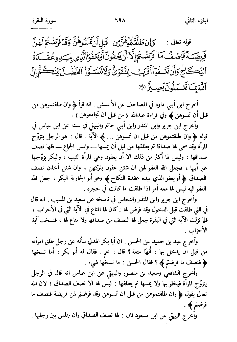 وَأخرج ابْن جرير وَابْن الْمُنْذر وَابْن أبي حَاتِم وَالْبَيْهَقِيّ فِي سنَنه عَن ابْن عَبَّاس فِي قَوْله {وَإِن طلقتموهن من قبل أَن تمَسُّوهُنَّ} الْآيَة