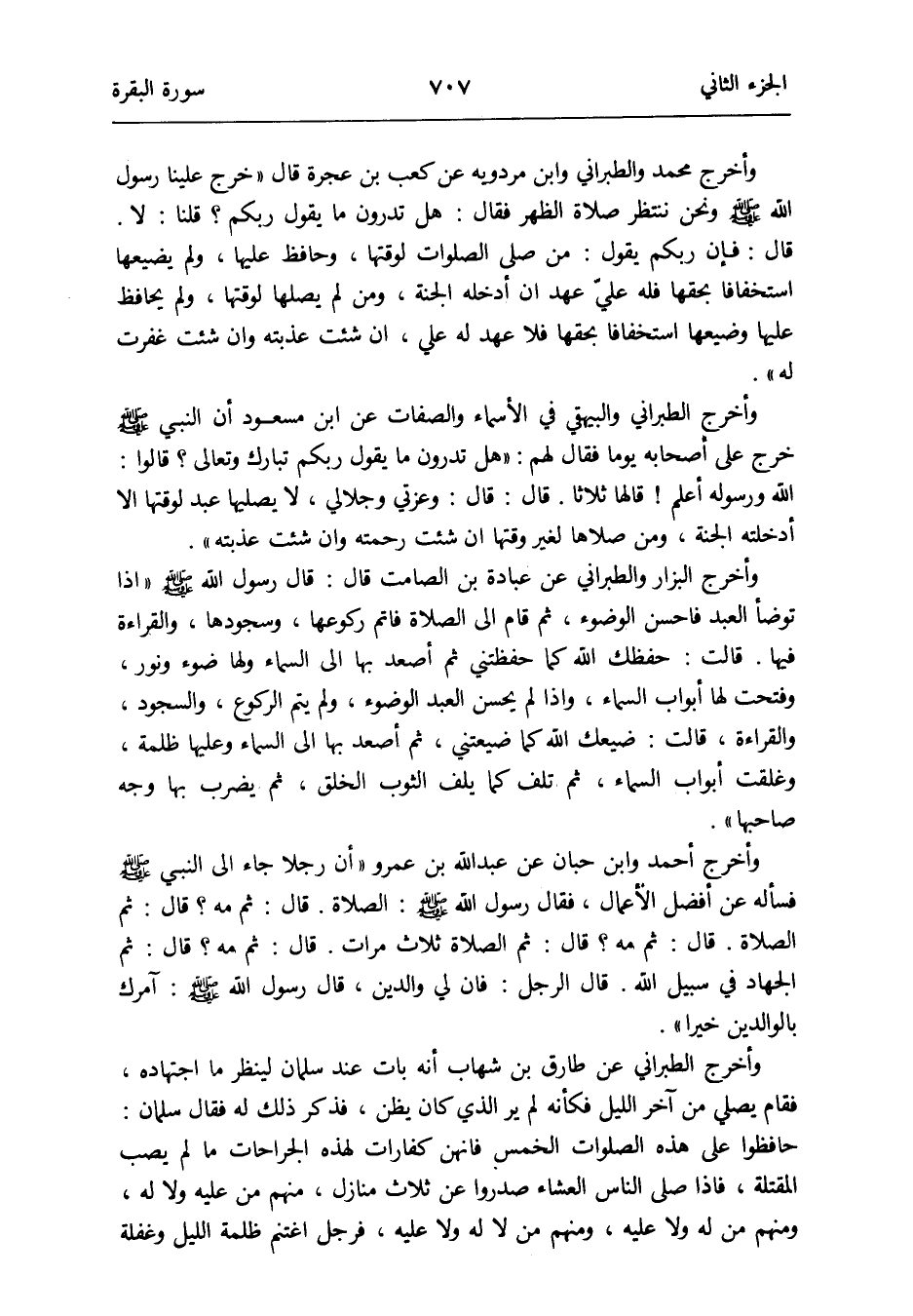 وَأخرج الطَّبَرَانِيّ عَن طَارق بن شهَاب أَنه بَات عِنْد سلمَان لينْظر مَا اجْتِهَاده فَقَامَ يُصَلِّي من آخر اللَّيْل فَكَأَنَّهُ لم ير الَّذِي يظنّ فَذكر ذَلِك لَهُ فَقَالَ سلمَان: حَافظُوا على هَذِه الصَّلَوَات الْخمس فَإِنَّهُنَّ كَفَّارَات لهَذِهِ الْجِرَاحَات مَا لم يصب المقتلة فَإِذا صلى النَّاس الْعشَاء صدرُوا عَن ثَلَاث لَيَال منَازِل مِنْهُم من عَلَيْهِ وَلَا لَهُ وَمِنْهُم من لَهُ وَلَا عَلَيْهِ وَمِنْهُم من لَا لَهُ وَلَا عَلَيْهِ فَرجل اغتنم ظلمَة اللَّيْل وغفلة النَّاس