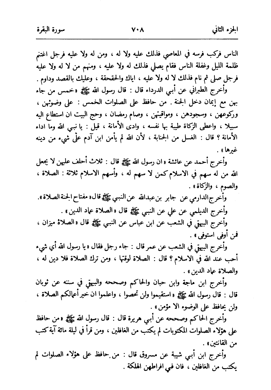 وَأخرج الْحَاكِم وَصَححهُ عَن أبي هرير قَالَ: قَالَ رَسُول الله صلى الله عَلَيْهِ وَسلم من حَافظ على هَؤُلَاءِ الصَّلَوَات المكتوبات لم يكْتب من الغافلين وَمن قَرَأَ فِي لَيْلَة مائَة آيَة كتب من القانتين