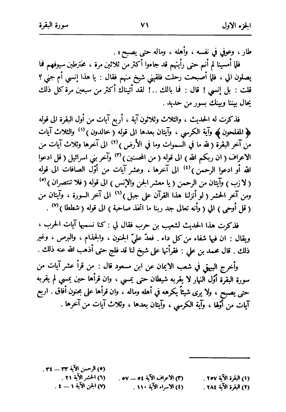فَذكرت لَهُ الحَدِيث وَالثَّلَاث وَثَلَاثُونَ آيَة أَربع آيَات من أول الْبَقَرَة إِلَى قَوْله {المفلحون} وَآيَة الْكُرْسِيّ وآيتان بعْدهَا إِلَى قَوْله (خَالدُونَ) (الْبَقَرَة الْآيَة 257) وَالثَّلَاث آيَات من آخر الْبَقَرَة (لله مَا فِي السَّمَوَات وَمَا فِي الأَرْض) (الْبَقَرَة الْآيَة 284) وَثَلَاث آيَات من الْأَعْرَاف (إِن ربكُم الله) إِلَى قَوْله (من الْمُحْسِنِينَ) (الْأَعْرَاف الْآيَة 54 - 57) وَآخر بني إِسْرَائِيل (قل ادعوا الله أَو ادعوا الرَّحْمَن) (الإِسراء الْآيَة 110) إِلَى آخرهَا وَعشر آيَات من أول الصافات إِلَى قَوْله (لَا زب) وآيتان من الرَّحْمَن (يَا معشر الْجِنّ والإِنس) إِلَى قَوْله (فَلَا تنتصران) (الرَّحْمَن الْآيَة 33 - 34) وَمن آخر الْحَشْر (لَو أنزلنَا هَذَا الْقُرْآن على جبل) (الْحَشْر الْآيَة 21) إِلَى آخر السُّورَة وآيتان من (قل أُوحِي إِلَيّ) إِلَى (وَأَنه تَعَالَى جد رَبنَا مَا اتخذ صَاحِبَة) إِلَى قَوْله (شططا) (الْجِنّ الْآيَة 1 - 4)
