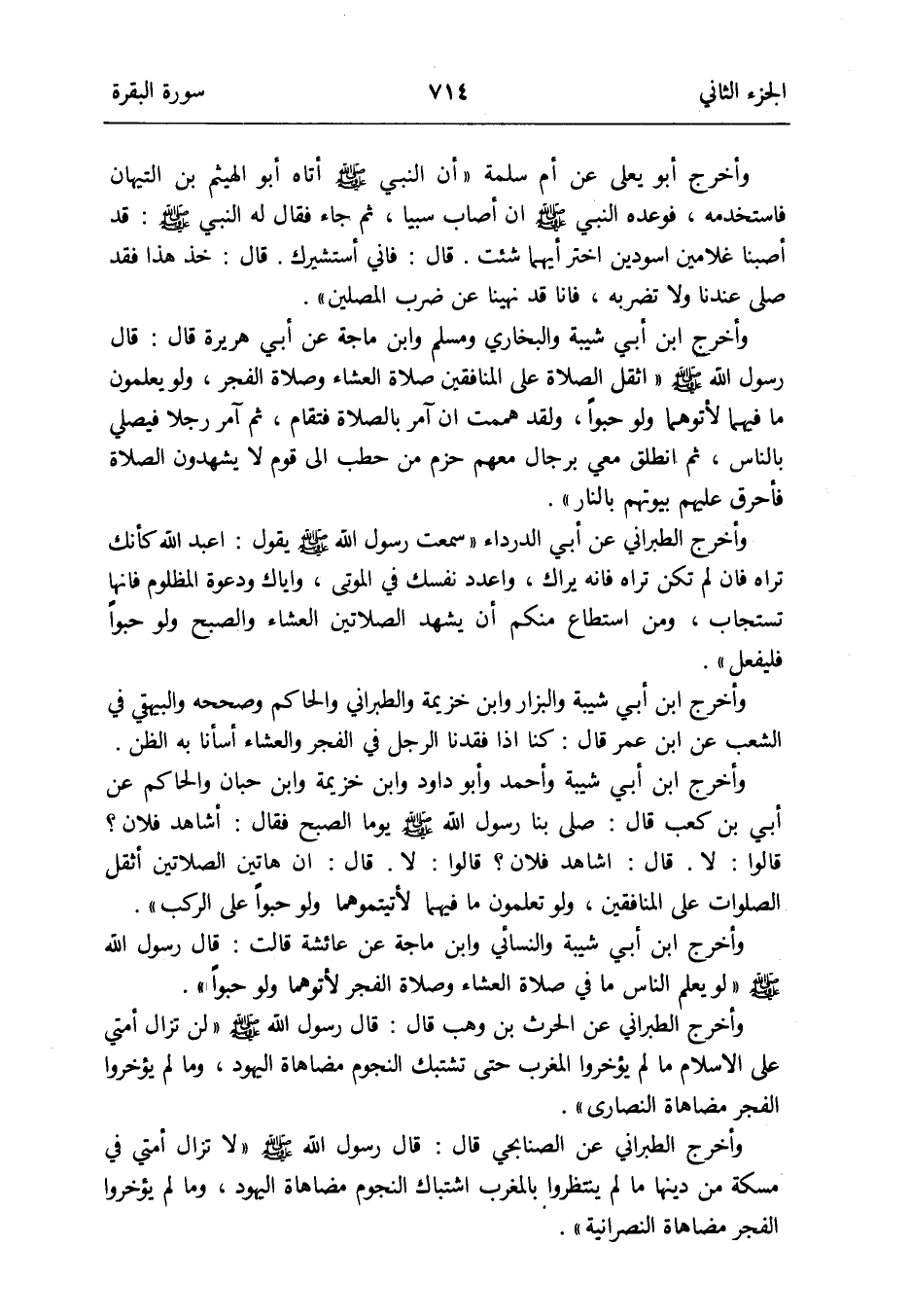 وَأخرج ابْن أبي شيبَة وَالْبُخَارِيّ وَمُسلم وَابْن ماجة عَن أبي هرير قَالَ: قَالَ رَسُول الله صلى الله عَلَيْهِ وَسلم أثقل الصَّلَاة على الْمُنَافِقين صَلَاة الْعشَاء وَالْفَجْر وَلَو يعلمُونَ مَا فيهمَا لأتوهما وَلَو حبواً وَلَقَد هَمَمْت أَن آمُر بِالصَّلَاةِ فتقام ثمَّ آمُر رجلا فَيصَلي بِالنَّاسِ ثمَّ انْطلق معي بِرِجَال مَعَهم حزم من حطب إِلَى قوم لَا يشْهدُونَ الصَّلَاة فَأحرق عَلَيْهِم بُيُوتهم بالنَّار