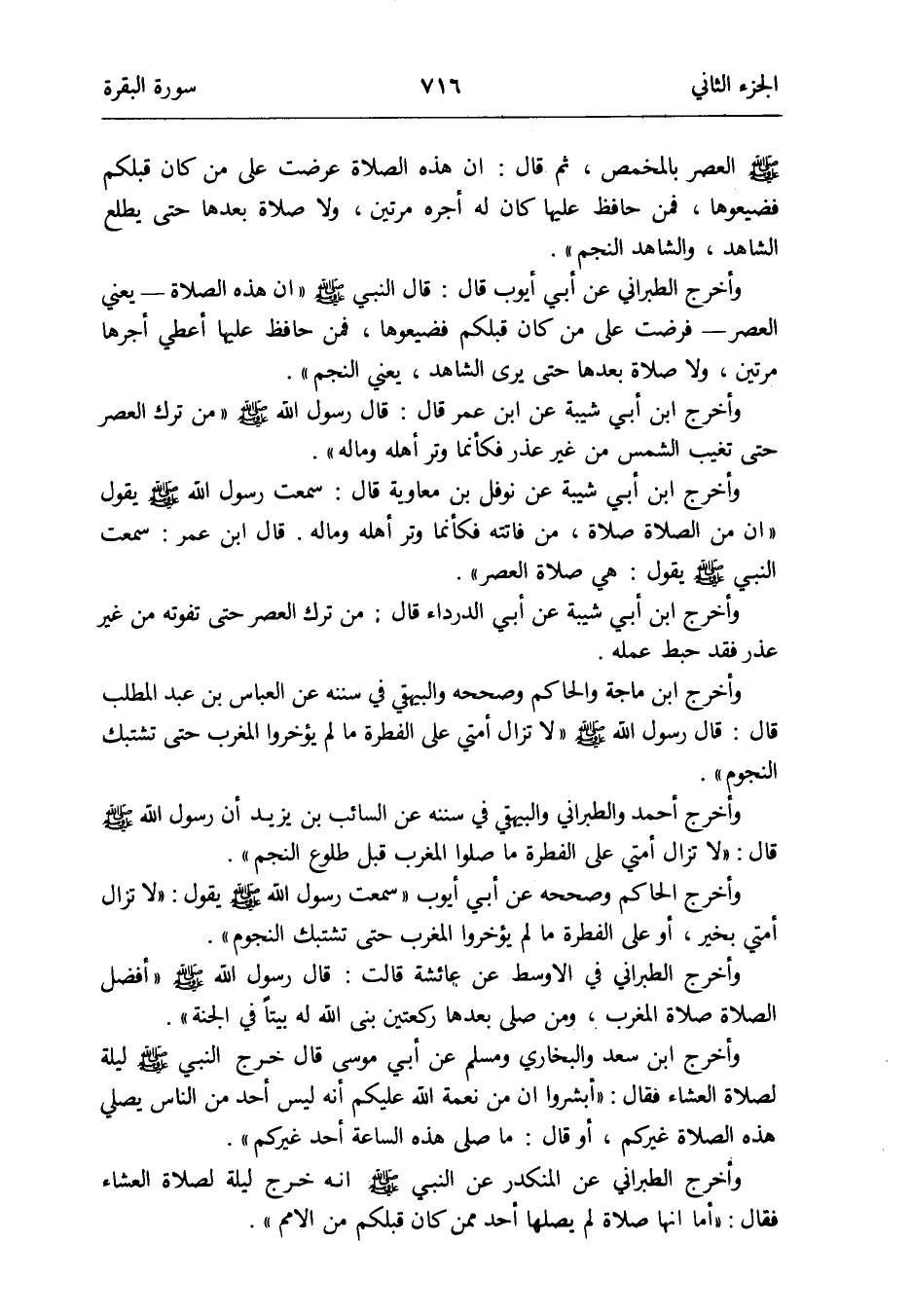 وَأخرج الطَّبَرَانِيّ عَن أبي أَيُّوب قَالَ: قَالَ النَّبِي صلى الله عَلَيْهِ وَسلم إِن هَذِه الصَّلَاة - يَعْنِي الْعَصْر - فرضت على من كَانَ قبلكُمْ فضيعوها فَمن حَافظ عَلَيْهَا أعطي أجرهَا مرَّتَيْنِ وَلَا صَلَاة بعْدهَا حَتَّى يرى الشَّاهِد يَعْنِي النَّجْم