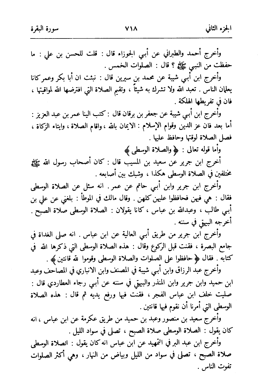 وَأخرج عبد الرَّزَّاق وَابْن أبي شيبَة فِي المُصَنّف وَابْن الْأَنْبَارِي فِي الْمَصَاحِف وَعبد بن حميد وَابْن جرير وَابْن الْمُنْذر وَالْبَيْهَقِيّ فِي سنَنه عَن أبي رَجَاء العطاردي قَالَ: صليت خلف ابْن عَبَّاس الْفجْر فقنت فِيهَا وَرفع يَدَيْهِ ثمَّ قَالَ: هَذِه الصَّلَاة الْوُسْطَى الَّتِي أمرنَا أَن نقوم فِيهَا قَانِتِينَ