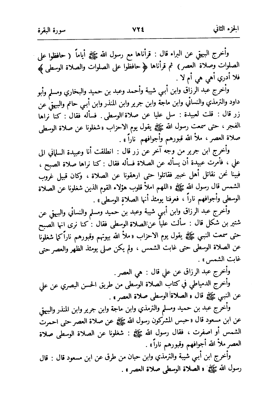 وَأخرج عبد الرَّزَّاق وَابْن أبي شيبَة وَأحمد وَعبد بن حميد وَالْبُخَارِيّ وَمُسلم وَأَبُو دَاوُد وَالتِّرْمِذِيّ وَالنَّسَائِيّ وَابْن ماجة وَابْن جرير وَابْن الْمُنْذر وَابْن أبي حَاتِم وَالْبَيْهَقِيّ عَن زر قَالَ: قلت لعبيدة: سل عليا عَن صَلَاة الْوُسْطَى