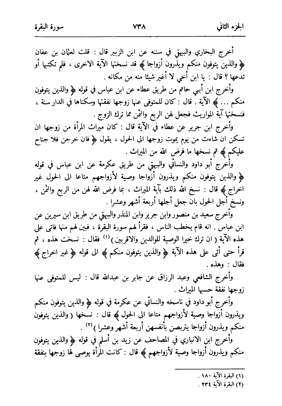 وَأخرج أَبُو دَاوُد وَالنَّسَائِيّ وَالْبَيْهَقِيّ من طَرِيق عِكْرِمَة عَن ابْن عَبَّاس فِي قَوْله {وَالَّذين يتوفون مِنْكُم ويذرون أَزْوَاجًا وَصِيَّة لأزواجهم مَتَاعا إِلَى الْحول غير إِخْرَاج} قَالَ: نسخ الله ذَلِك بِآيَة الْمِيرَاث بِمَا فرض الله لَهُنَّ من الرّبع وَالثمن وَنسخ أجل الْحول بِأَن جعل أجلهَا أَرْبَعَة أشهر وَعشرا