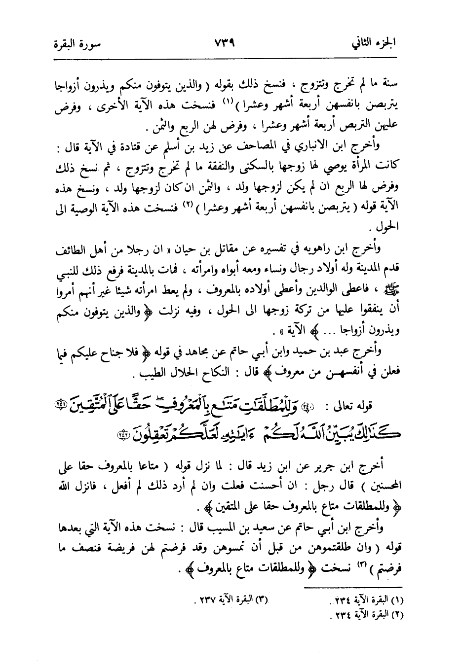 أخرج ابْن جرير عَن ابْن زيد قَالَ: لما نزل قَوْله (مَتَاعا بِالْمَعْرُوفِ حَقًا على الْمُحْسِنِينَ) قَالَ رجل: إِن أَحْسَنت فعلت وَإِن لم أرد ذَلِك لم أفعل فَأنْزل الله {وللمطلقات مَتَاع بِالْمَعْرُوفِ حَقًا على الْمُتَّقِينَ}