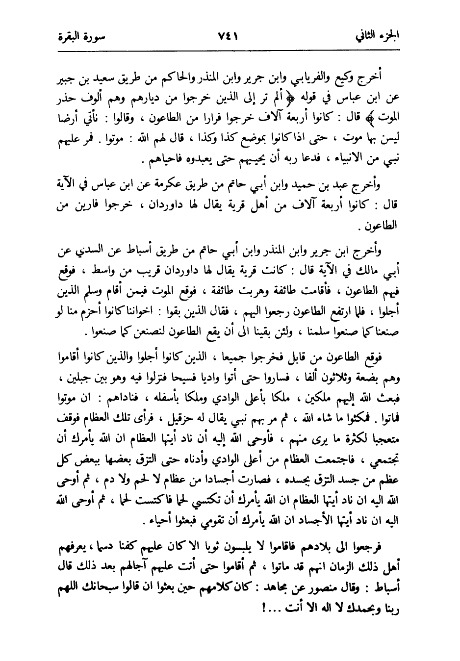 أخرج وَكِيع وَالْفِرْيَابِي وَابْن جرير وَابْن الْمُنْذر وَالْحَاكِم من طَرِيق سعيد بن جُبَير عَن ابْن عَبَّاس فِي قَوْله {ألم تَرَ إِلَى الَّذين خَرجُوا من دِيَارهمْ وهم أُلُوف حذر الْمَوْت} قَالَ: كَانُوا أَرْبَعَة آلَاف خَرجُوا فِرَارًا من الطَّاعُون وَقَالُوا: نأتي أَرضًا لَيْسَ بهَا موت حَتَّى إِذا كَانُوا بِموضع كَذَا وَكَذَا قَالَ لَهُم الله: موتوا
