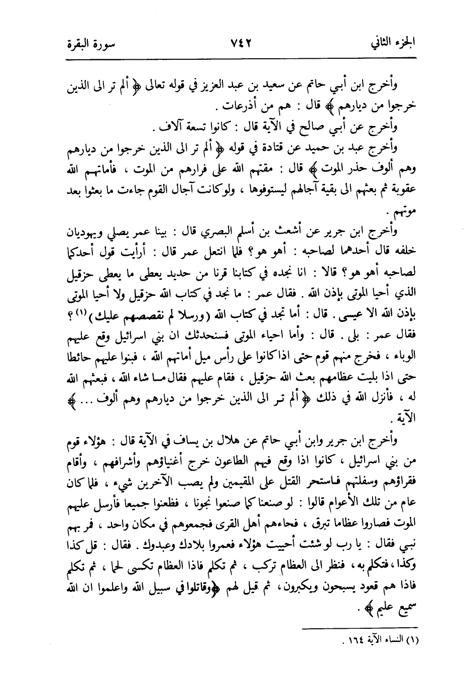 وَأخرج ابْن أبي حَاتِم عَن سعيد بن عبد الْعَزِيز فِي قَوْله تَعَالَى {ألم تَرَ إِلَى الَّذين خَرجُوا من دِيَارهمْ} قَالَ: هم من أَذْرُعَات