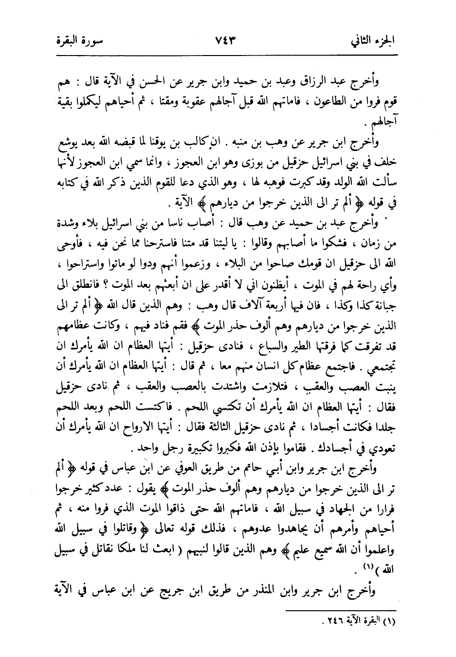 وَأخرج ابْن جرير وَابْن أبي حَاتِم من طَرِيق الْعَوْفِيّ عَن ابْن عَبَّاس فِي قَوْله {ألم تَرَ إِلَى الَّذين خَرجُوا من دِيَارهمْ وهم أُلُوف حذر الْمَوْت} يَقُول: عدد كثير خَرجُوا فِرَارًا من الْجِهَاد فِي سَبِيل الله فأماتهم الله حَتَّى ذاقوا الْمَوْت الَّذِي فروا مِنْهُ ثمَّ أحياهم وَأمرهمْ أَن يجاهدوا عدوهم فَذَلِك قَوْله {وقاتلوا فِي سَبِيل الله وَاعْلَمُوا أَن الله سميع عليم} وهم الَّذين قَالُوا لنبيهم (ابْعَثْ ملكا نُقَاتِل فِي سَبِيل الله) (الْبَقَرَة الْآيَة 246)