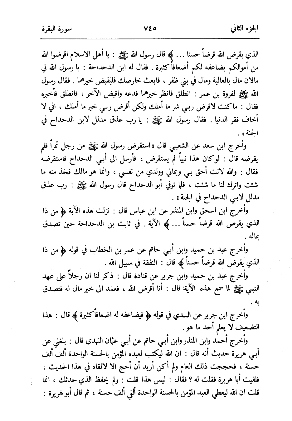 وَأخرج ابْن إِسْحَق وَابْن الْمُنْذر عَن ابْن عَبَّاس قَالَ: نزلت هَذِه الْآيَة {من ذَا الَّذِي يقْرض الله قرضا حسنا} الْآيَة