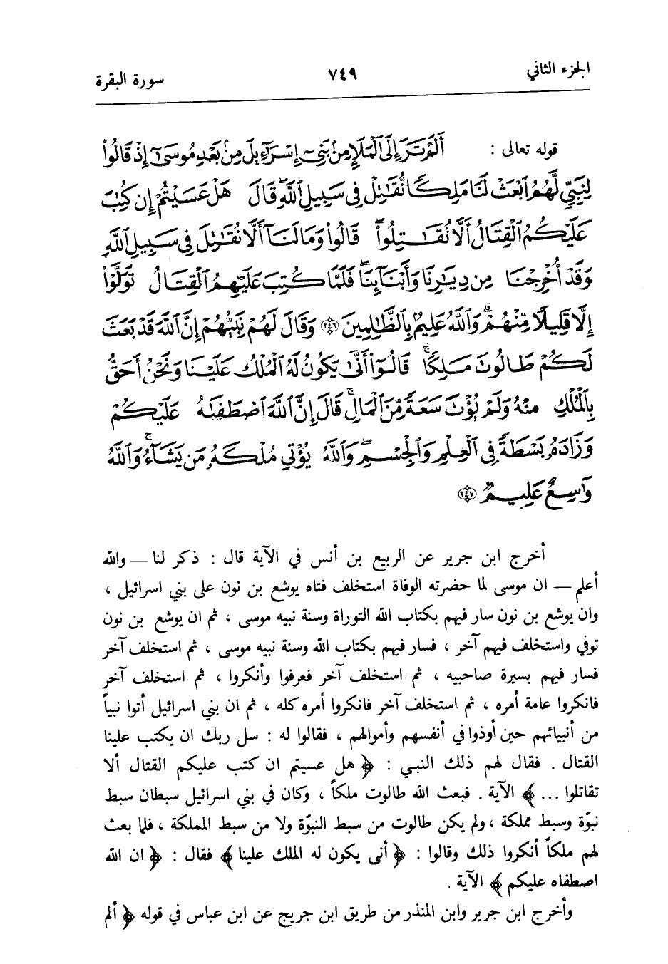 قَوْله تَعَالَى: ألم تَرَ إِلَى الْمَلأ من بني إِسْرَائِيل من بعد مُوسَى إِذْ قَالُوا لنَبِيّ لَهُم ابْعَثْ لنا ملكا نُقَاتِل فِي سَبِيل الله قَالَ هَل عسيتم إِن كتب عَلَيْكُم الْقِتَال أَلا تقاتلوا قَالُوا ومالنا أَلا نُقَاتِل فِي سَبِيل الله وَقد أخرجنَا من دِيَارنَا وأبائنا فَلَمَّا كتب عَلَيْهِم الْقِتَال تواوا إِلَّا قَلِيلا مِنْهُم وَالله عليم بالظالمين وَقَالَ لَهُم نَبِيّهم إِن الله قد بعث لكم طالوت ملكا قَالُوا أَنى يكون لَهُ الْملك علينا وَنحن أَحَق بِالْملكِ مِنْهُ وَلم يُؤْت سَعَة من المَال قَالَ إِن الله اصطفاه عَلَيْكُم وزداه بسطة فِي الْعلم والجسم وَالله يُؤْتِي ملكه من يَشَاء وَالله وَاسع عليم