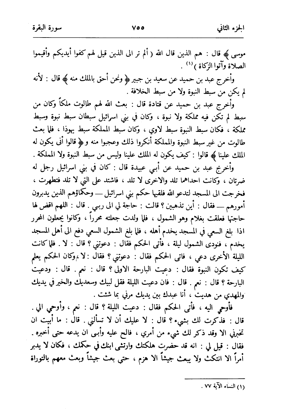 وَأخرج عبد بن حميد عَن سعيد بن جُبَير {وَنحن أَحَق بِالْملكِ مِنْهُ} قَالَ: لِأَنَّهُ لم يكن من سبط النُّبُوَّة وَلَا من سبط الْخلَافَة