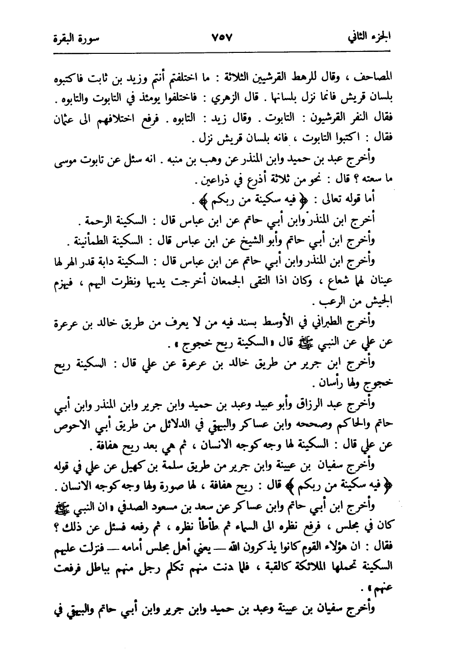 أخرج ابْن الْمُنْذر وَابْن أبي حَاتِم عَن ابْن عَبَّاس قَالَ: السكينَة دَابَّة قدر الهر لَهَا عينان لَهما شُعَاع وَكَانَ إِذا التقى الْجَمْعَانِ أخرجت يَديهَا وَنظرت إِلَيْهِم فيهزم الْجَيْش من الرعب