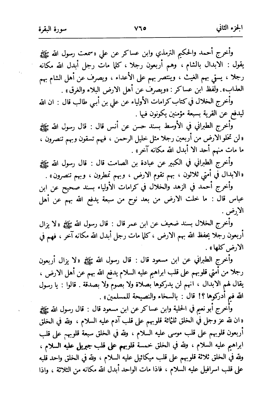وَأخرج الطَّبَرَانِيّ عَن ابْن مَسْعُود قَالَ: قَالَ رَسُول الله صلى الله عَلَيْهِ وَسلم لَا يزَال أَرْبَعُونَ رجلا من أمتِي قُلُوبهم على قلب إِبْرَاهِيم عَلَيْهِ السَّلَام يدْفع الله بهم عَن أهل الأَرْض يُقَال لَهُم الابدال إِنَّهُم لن يدركوها بِصَلَاة وَلَا بِصَوْم وَلَا بِصَدقَة