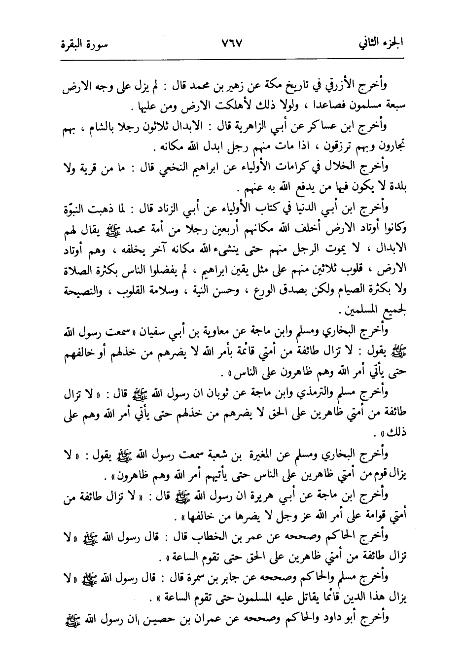 وَأخرج البُخَارِيّ وَمُسلم وَابْن مَاجَه عَن مُعَاوِيَة بن أبي سُفْيَان سَمِعت رَسُول الله صلى الله عَلَيْهِ وَسلم يَقُول: لَا تزَال طَائِفَة من أمتِي قَائِمَة بِأَمْر الله لَا يضرهم من خذلهم أَو خالفهم حَتَّى يَأْتِي أَمر الله وهم ظاهرون على النَّاس