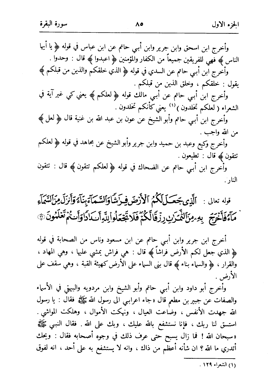 أخرج ابْن جرير وَابْن أبي حَاتِم عَن ابْن مَسْعُود وناس من الصَّحَابَة فِي قَوْله {الَّذِي جعل لكم الأَرْض فراشا} قَالَ: هِيَ فرَاش يمشي عَلَيْهَا وَهِي المهاد والقرار {وَالسَّمَاء بِنَاء} قَالَ بنى السَّمَاء على الأَرْض كَهَيئَةِ الْقبَّة وَهِي سقف على الأَرْض