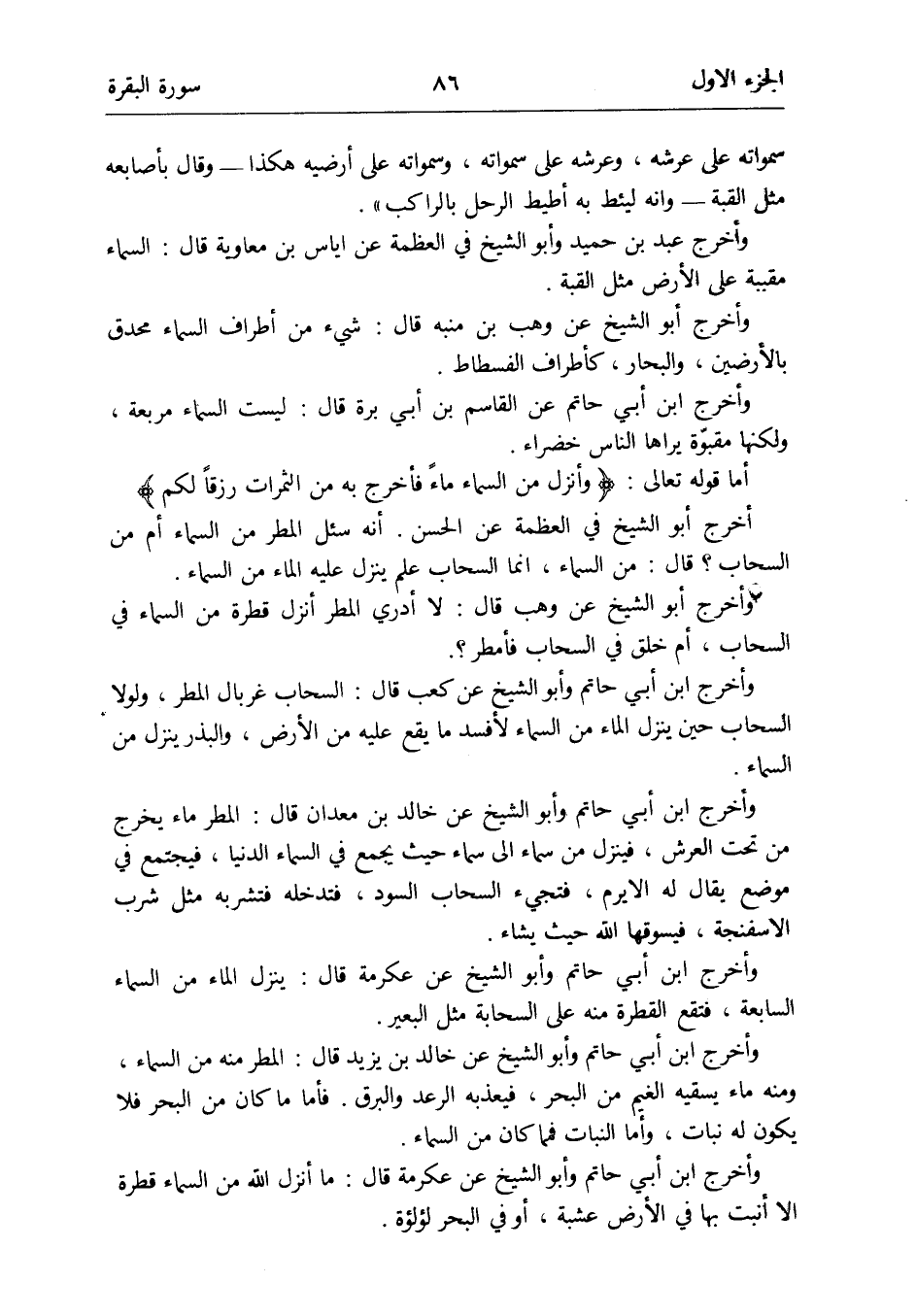 وَأخرج ابْن أبي حَاتِم وَأَبُو الشَّيْخ عَن عِكْرِمَة قَالَ: ينزل المَاء من السَّمَاء السَّابِعَة فَتَقَع القطرة مِنْهُ على السحابة مثل الْبَعِير