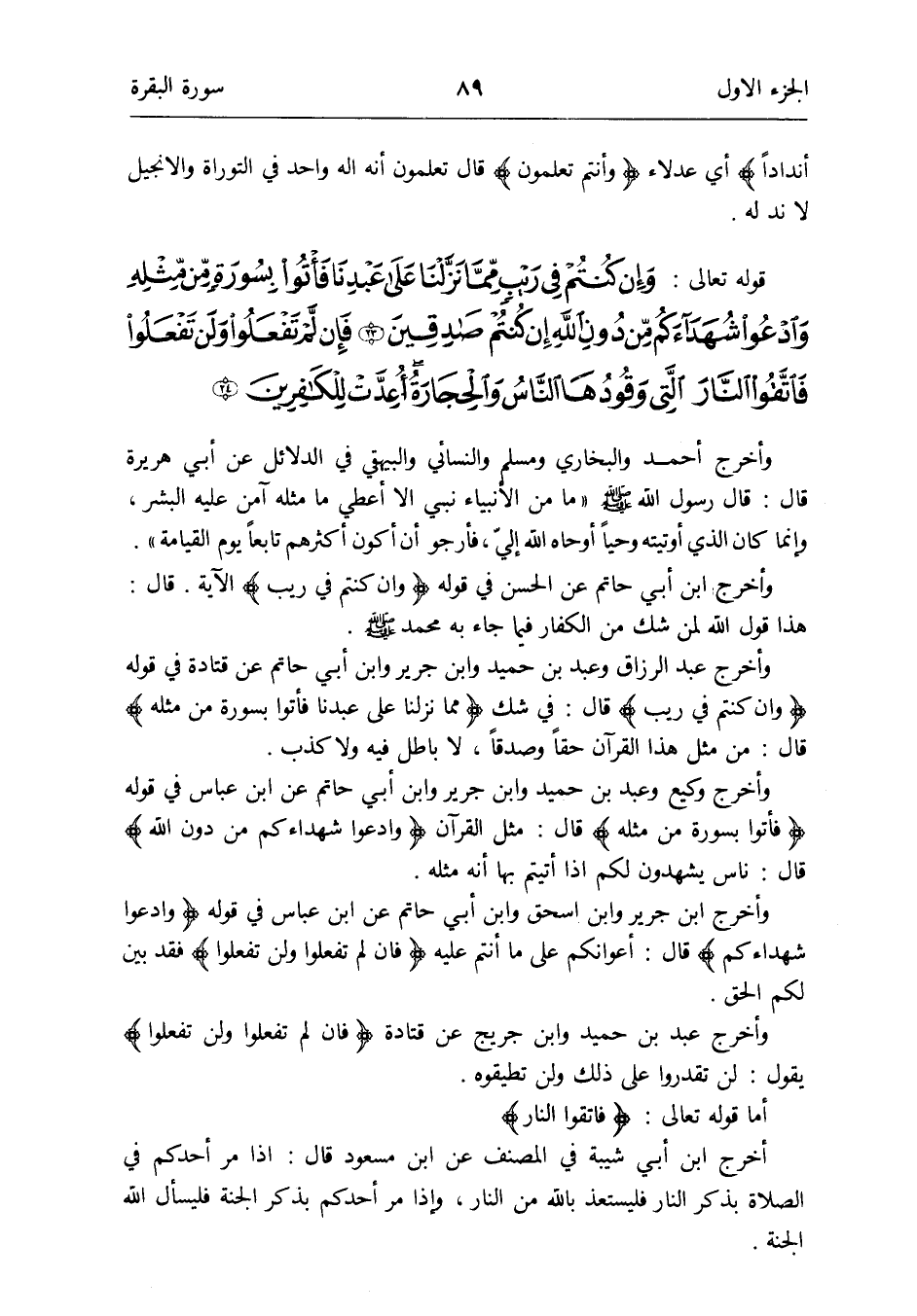 قَوْله تَعَالَى: وَأَن كُنْتُم فِي ريب مِمَّا نزلنَا على عَبدنَا فَأتوا بِسُورَة من مثله وَادعوا شهداءكم من دون الله إِن كُنْتُم صَادِقين فَإِن لم تَفعلُوا وَلنْ تَفعلُوا فَاتَّقُوا النَّار الَّتِي وقودها النَّاس وَالْحِجَارَة أعدت للْكَافِرِينَ