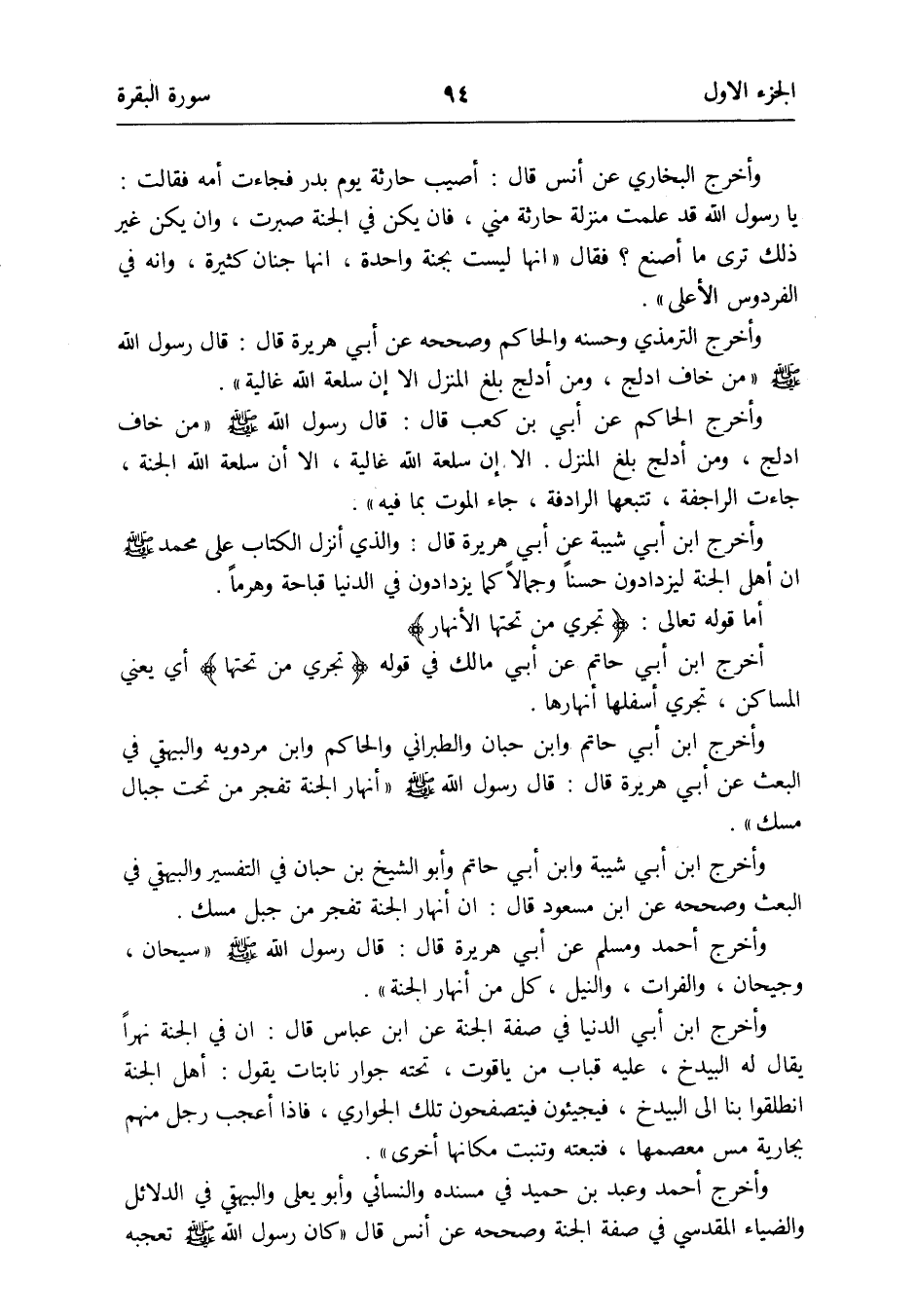 وَأخرج البُخَارِيّ عَن أنس قَالَ: أُصِيب حَارِثَة يَوْم بدر فَجَاءَت أمه فَقَالَت: يَا رَسُول الله قد علمت منزلَة حَارِثَة مني فَإِن يكن فِي الْجنَّة صبرت وَإِن يكن غير ذَلِك ترى مَا أصنع فَقَالَ إِنَّهَا لَيست بجنة وَاحِدَة إِنَّهَا جنان كَثِيرَة وَإنَّهُ فِي الفردوس الْأَعْلَى