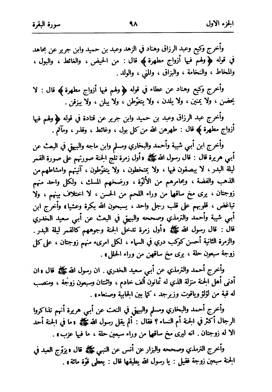 وَأخرج ابْن أبي شيبَة وَأحمد وَالْبُخَارِيّ وَمُسلم وَابْن ماجة وَالْبَيْهَقِيّ فِي الْبَعْث عَن أبي هُرَيْرَة قَالَ: قَالَ رَسُول الله صلى الله عَلَيْهِ وَسلم أول زمرة تلج الْجنَّة صورتهم على صُورَة الْقَمَر لَيْلَة الْبَدْر لايبصقون فِيهَا ولايتمخطون ولايتغوطون آنيتهم وأمشاطهم من الذَّهَب وَالْفِضَّة ومجامرهم من الألوّة ورضخهم الْمسك وَلكُل وَاحِد مُهِمّ زوجتان يرى مخ سَاقهَا من وَرَاء اللَّحْم من الْحسن لااختلاف بَينهم وَلَا تباغض قُلُوبهم على قلب رجل وَاحِد يسبحون الله بكرَة وعشيا