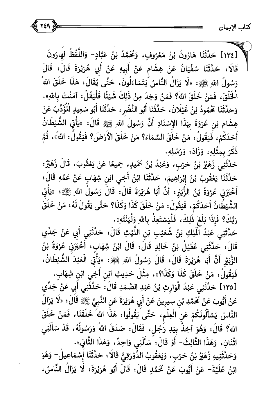 [١٣٥] حَدَّثَنِي عَبْدُ الْوَارِثِ بْنُ عَبْدِ الصَّمَدِ قَالَ: حَدَّثَنِي أَبِي عَنْ جَدِّي عَنْ أَيُّوبَ عَنْ مُحَمَّدِ بْنِ سِيرِينَ عَنْ أَبِي هُرَيْرَةَ عَنِ النَّبِيِّ صلى الله عليه وسلم قَالَ: ((لَا يَزَالُ النَّاسُ يَسْأَلُونَكُمْ عَنِ الْعِلْمِ، حَتَّى يَقُولُوا: هَذَا اللَّهُ خَلَقَنَا، فَمَنْ خَلَقَ اللَّهَ؟ قَالَ: وَهُوَ آخِذٌ بِيَدِ رَجُلٍ، فَقَالَ: صَدَقَ اللَّهُ وَرَسُولُهُ، قَدْ سَأَلَنِي اثْنَانِ، وَهَذَا الثَّالِثُ- أَوْ قَالَ: سَأَلَنِي وَاحِدٌ، وَهَذَا الثَّانِي)).